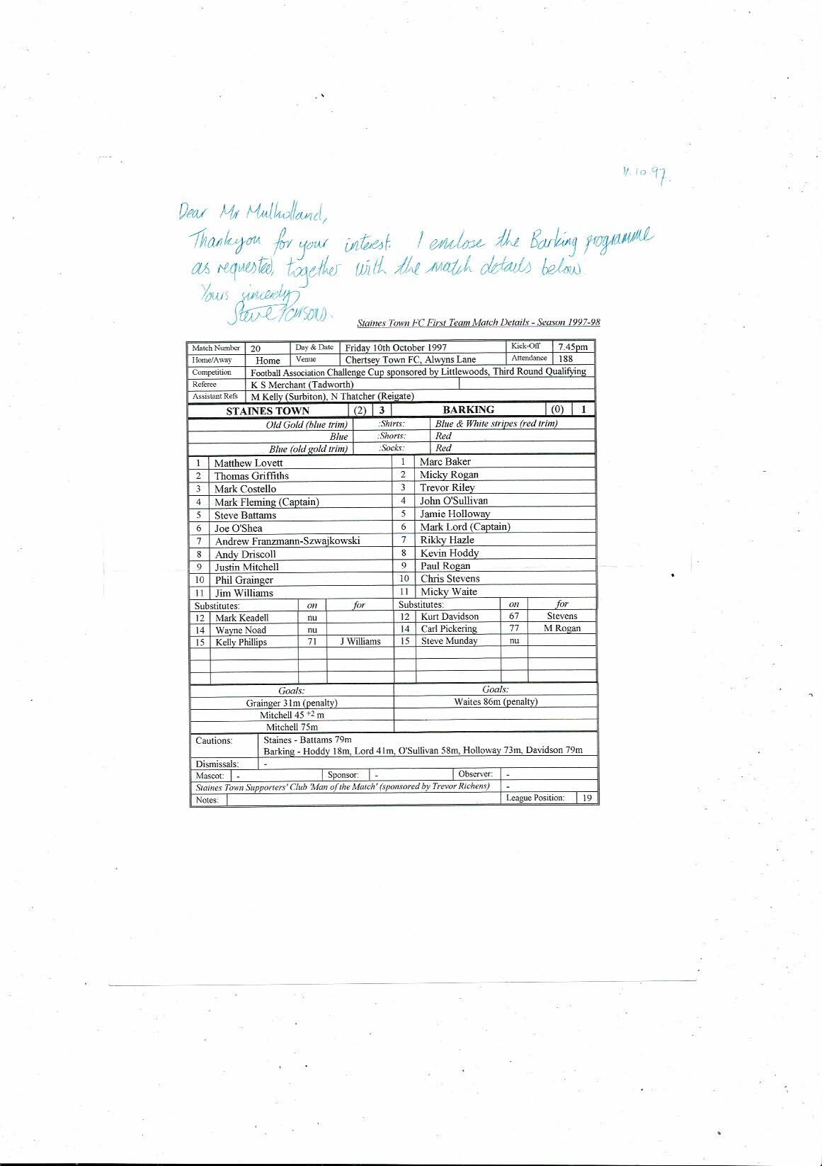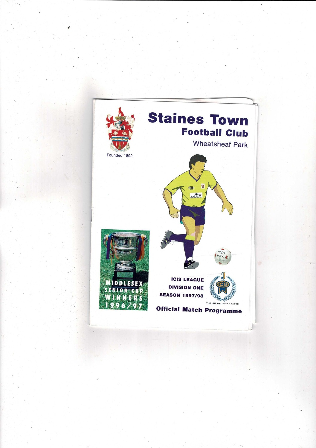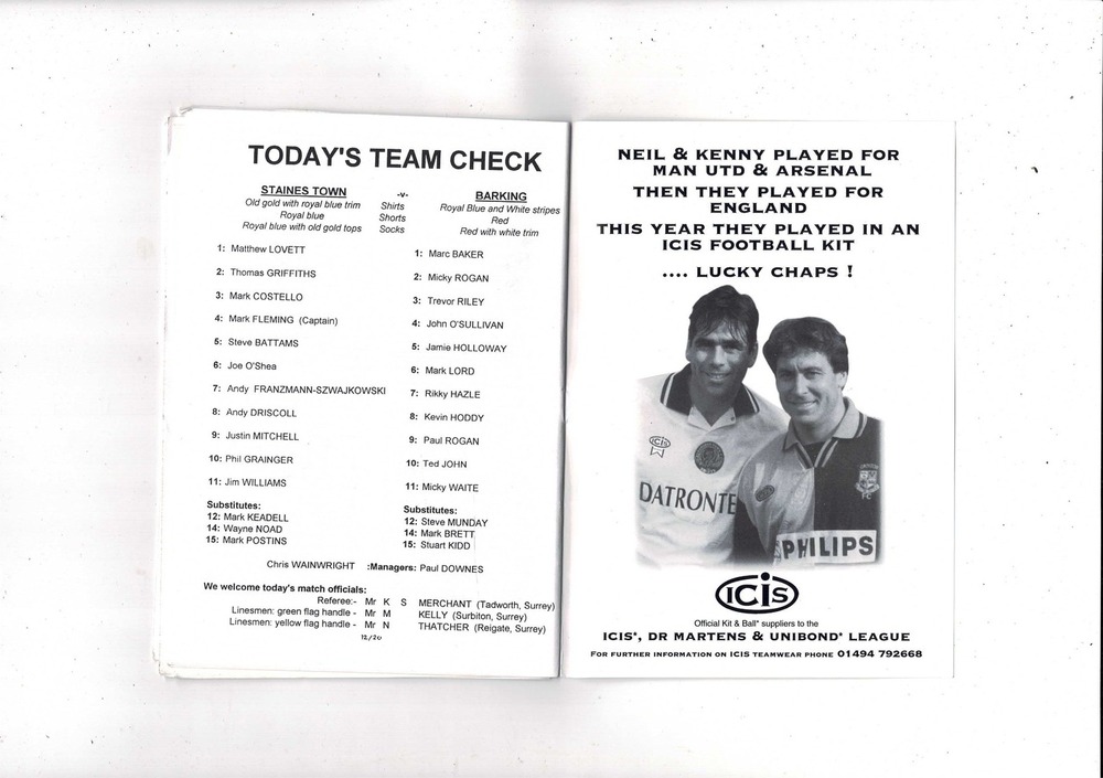 Staines Town v Barking FA Cup Football Programme + Team Sheet 1997/98
