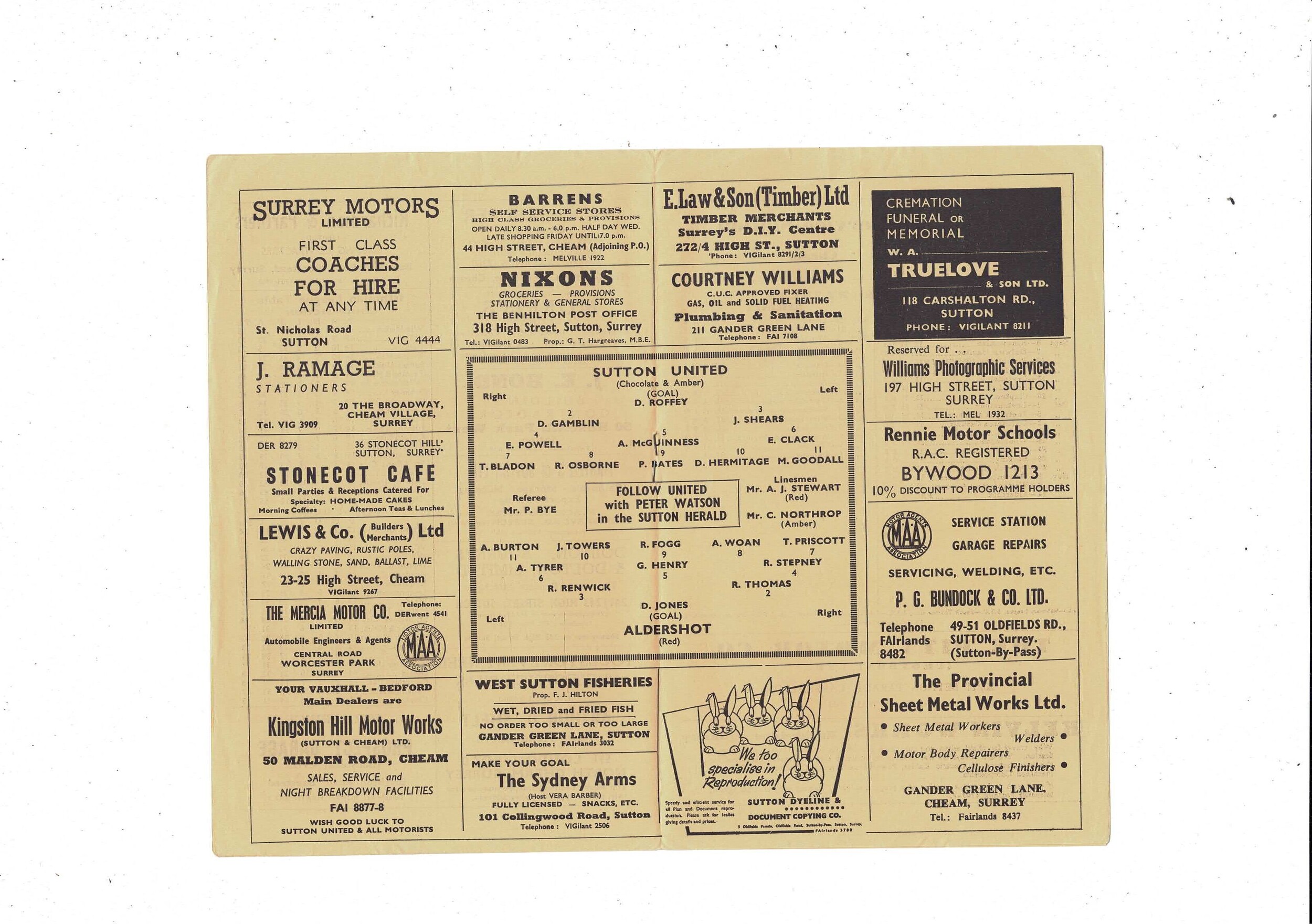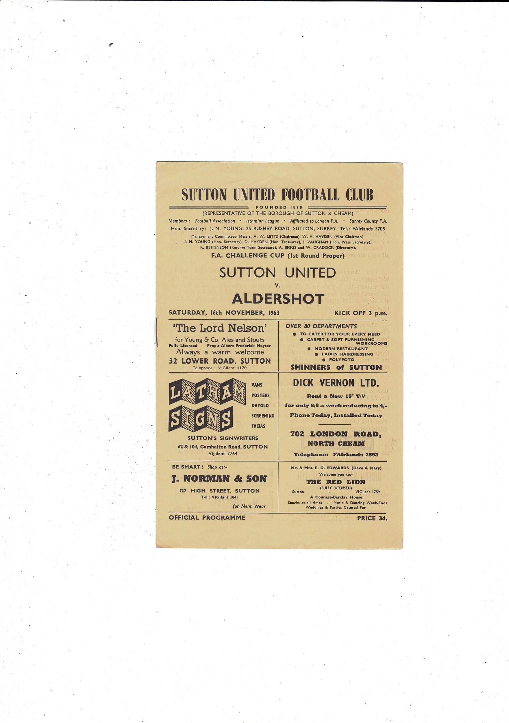 Sutton United v Aldershot FA Cup Football Programme 1963/64