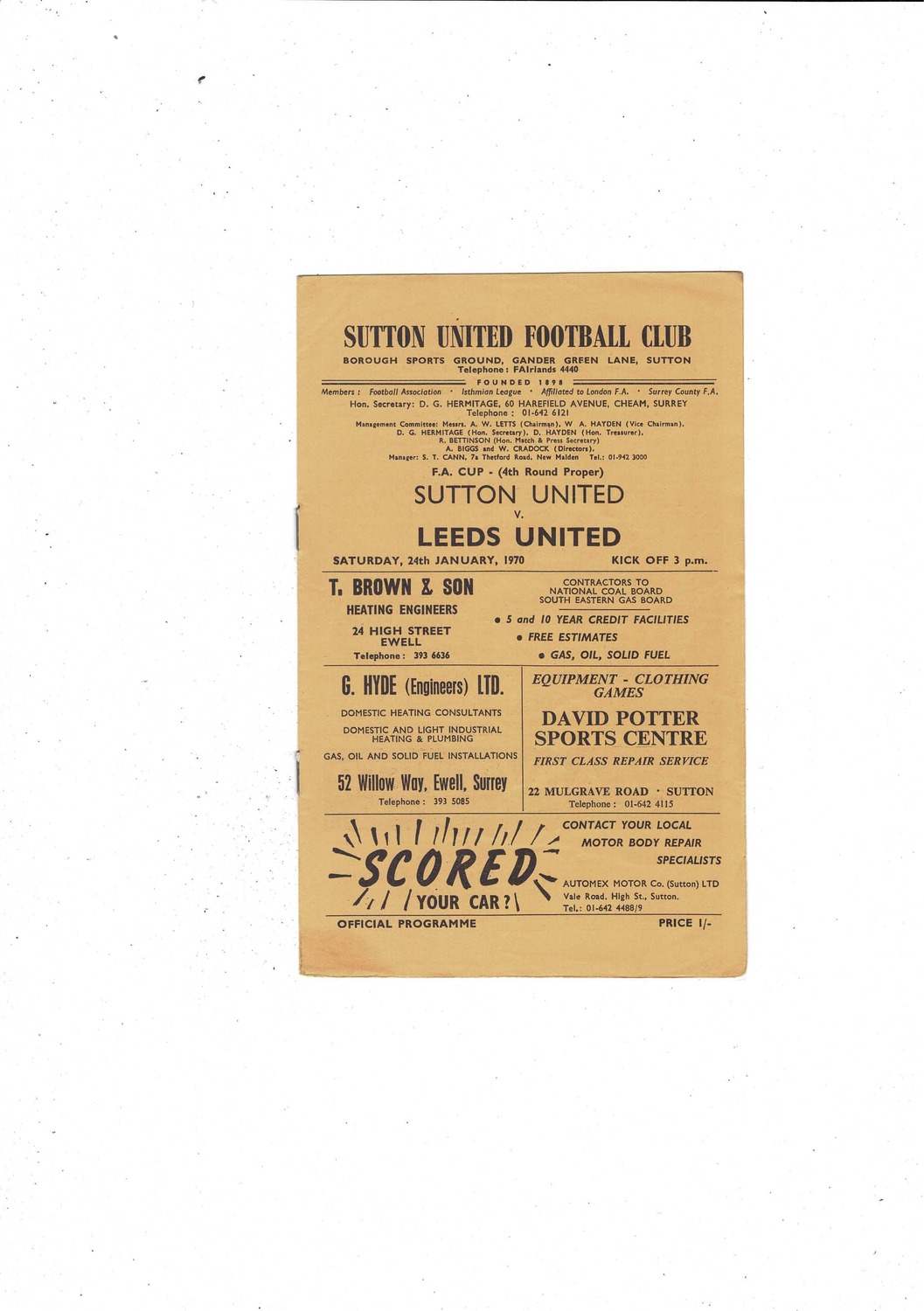 Sutton United v Leeds United FA Cup Football Programme 1970/71