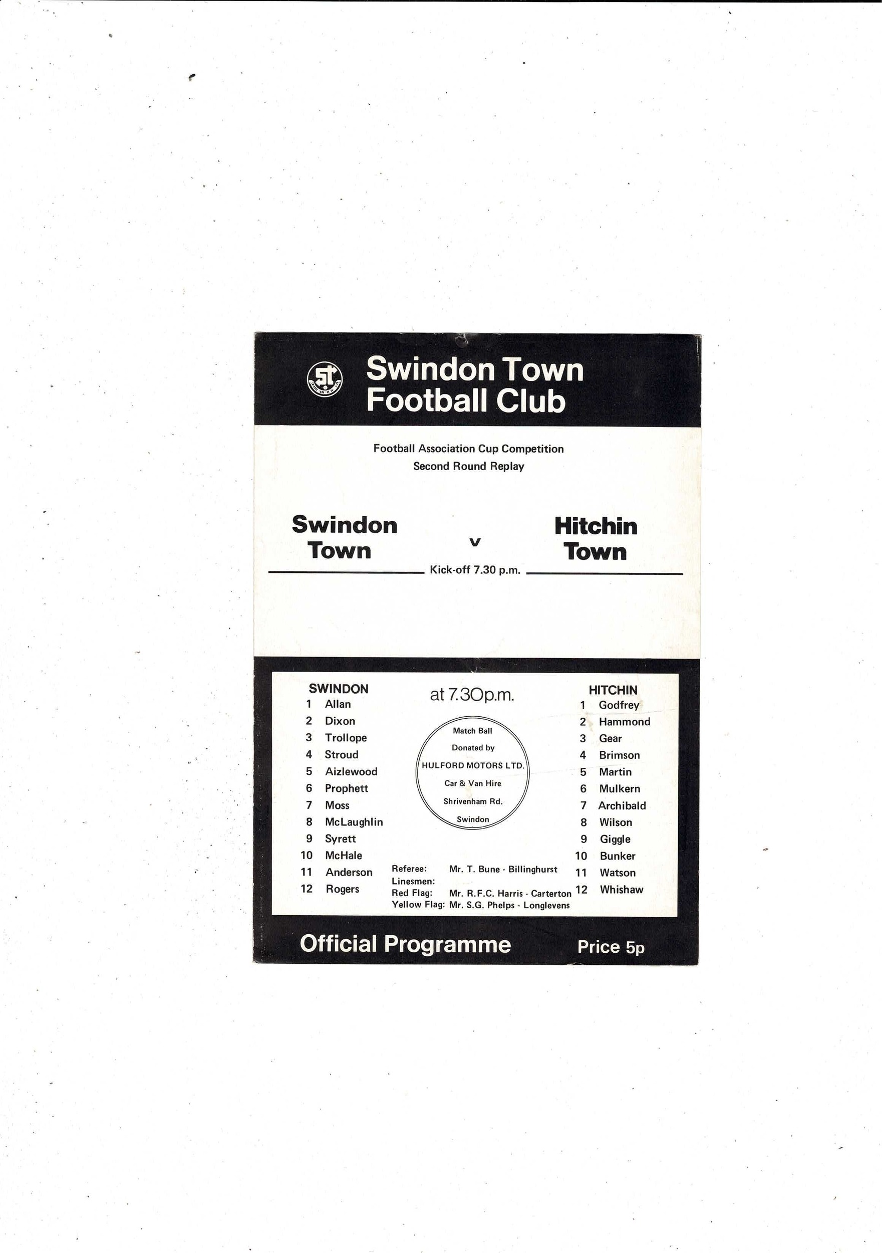 Swindon Town v Hitchin Town 2nd Round Replay FA Cup Football Programme 1976/77