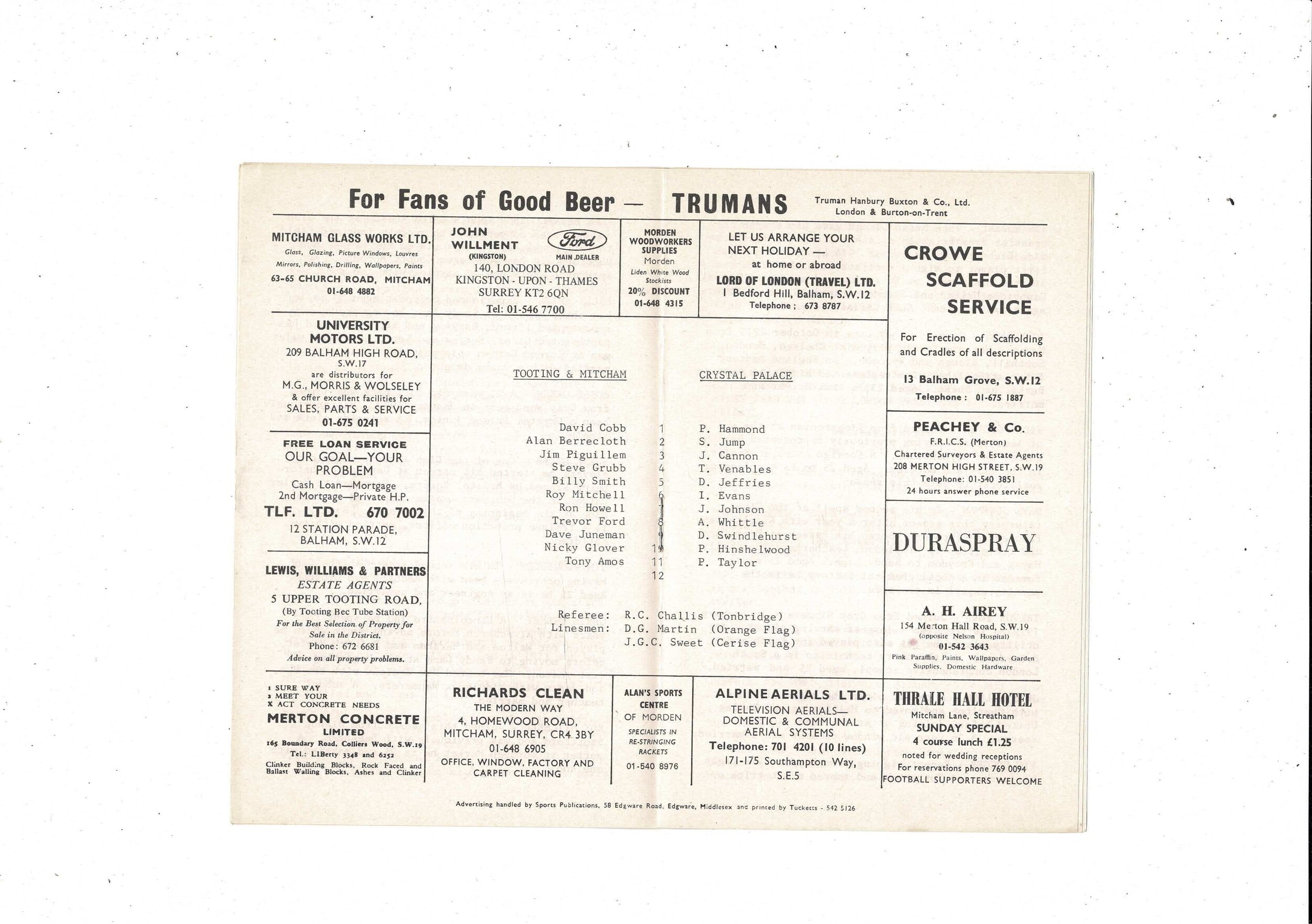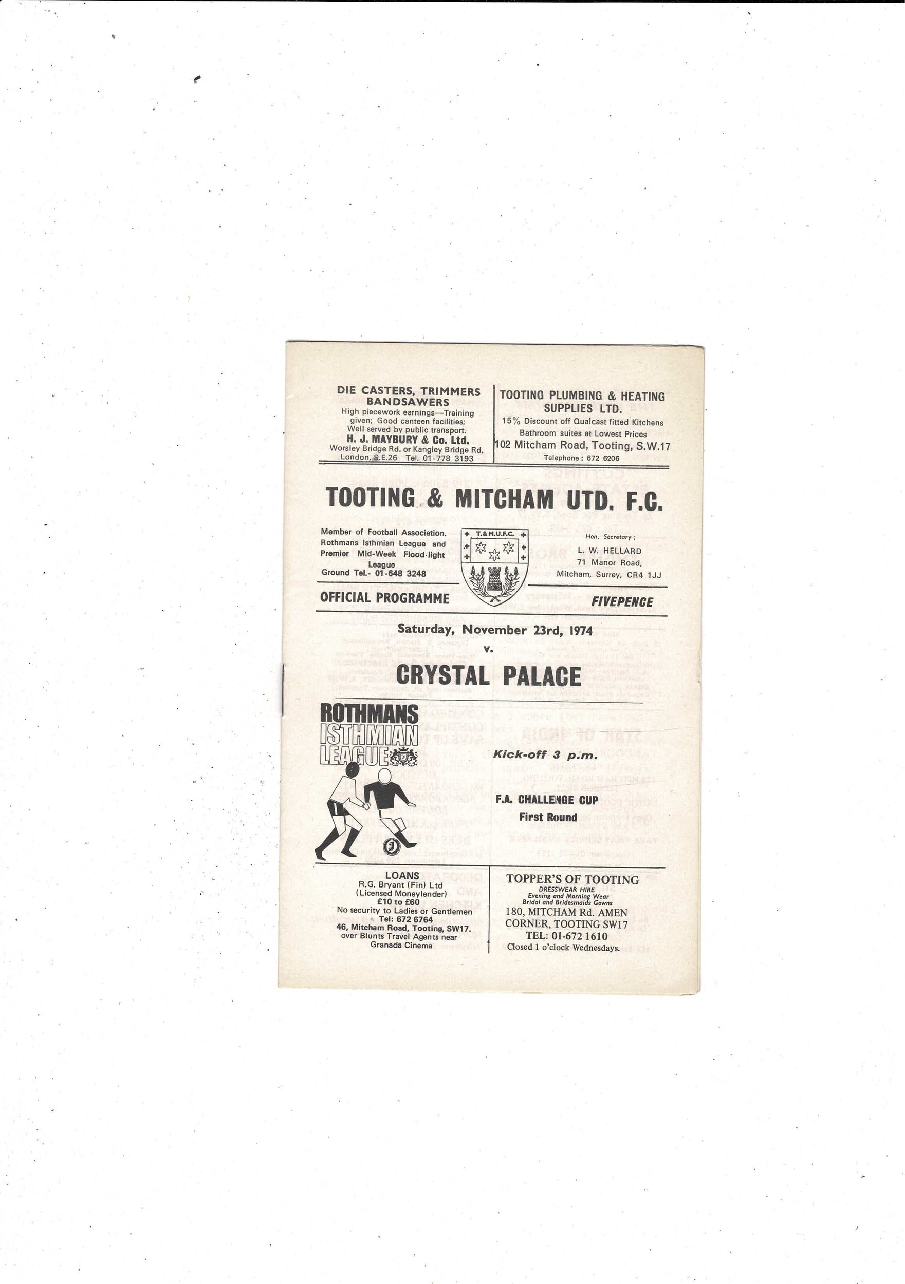 Tooting & Mitcham v Crystal Palace FA Cup Football Programme 1974/75