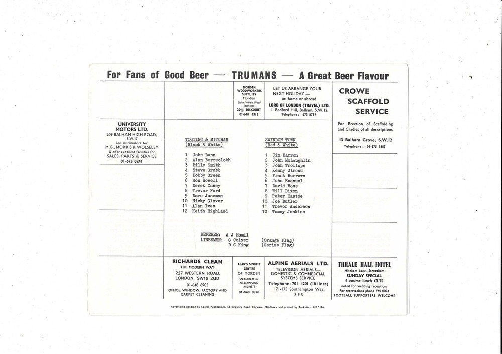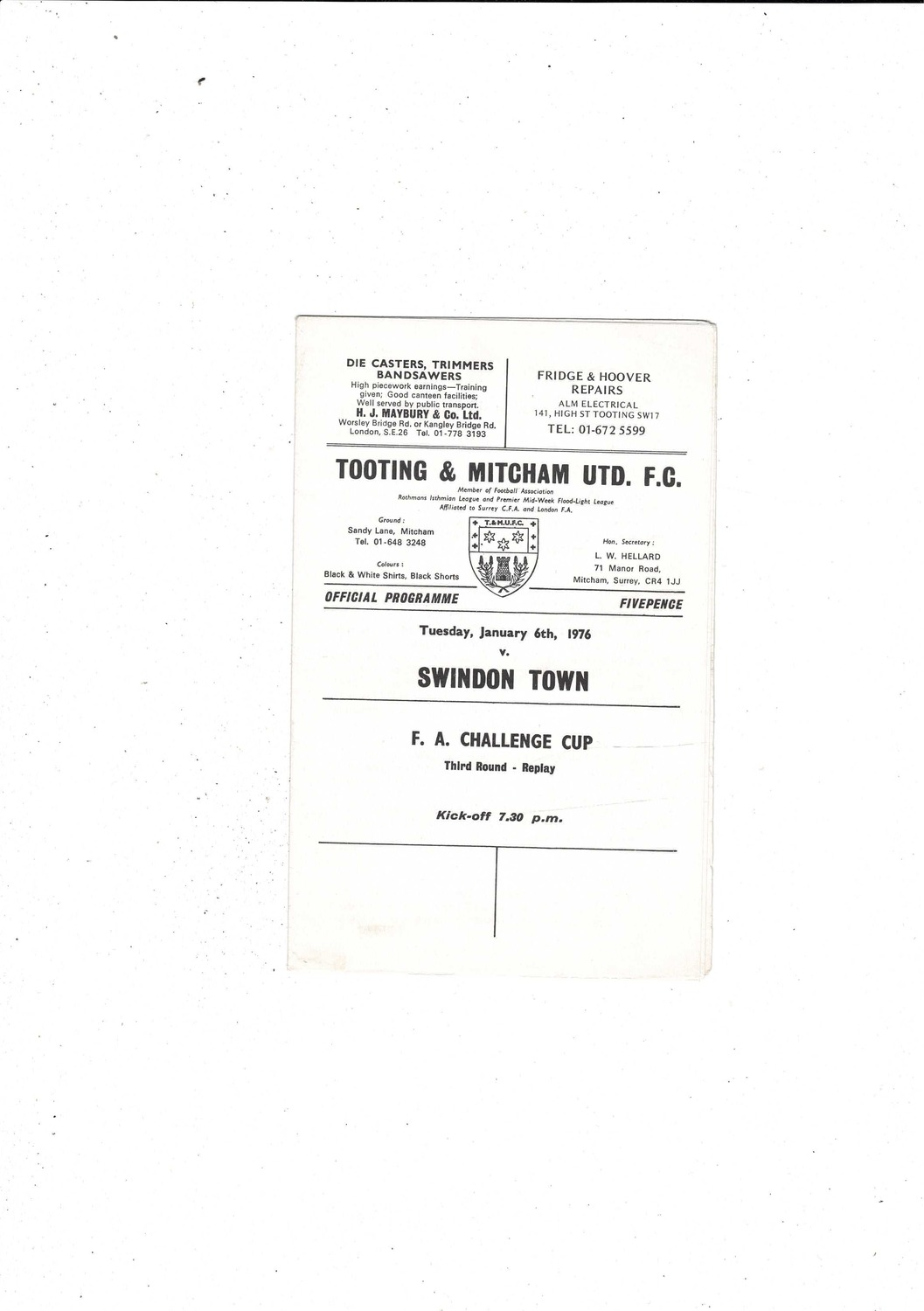 Tooting & Mitcham v Swindon Town FA Cup Replay Football Programme 1975/76