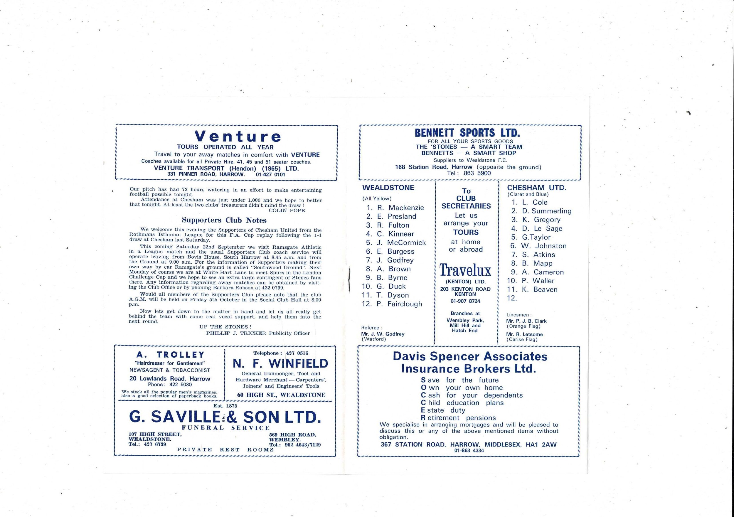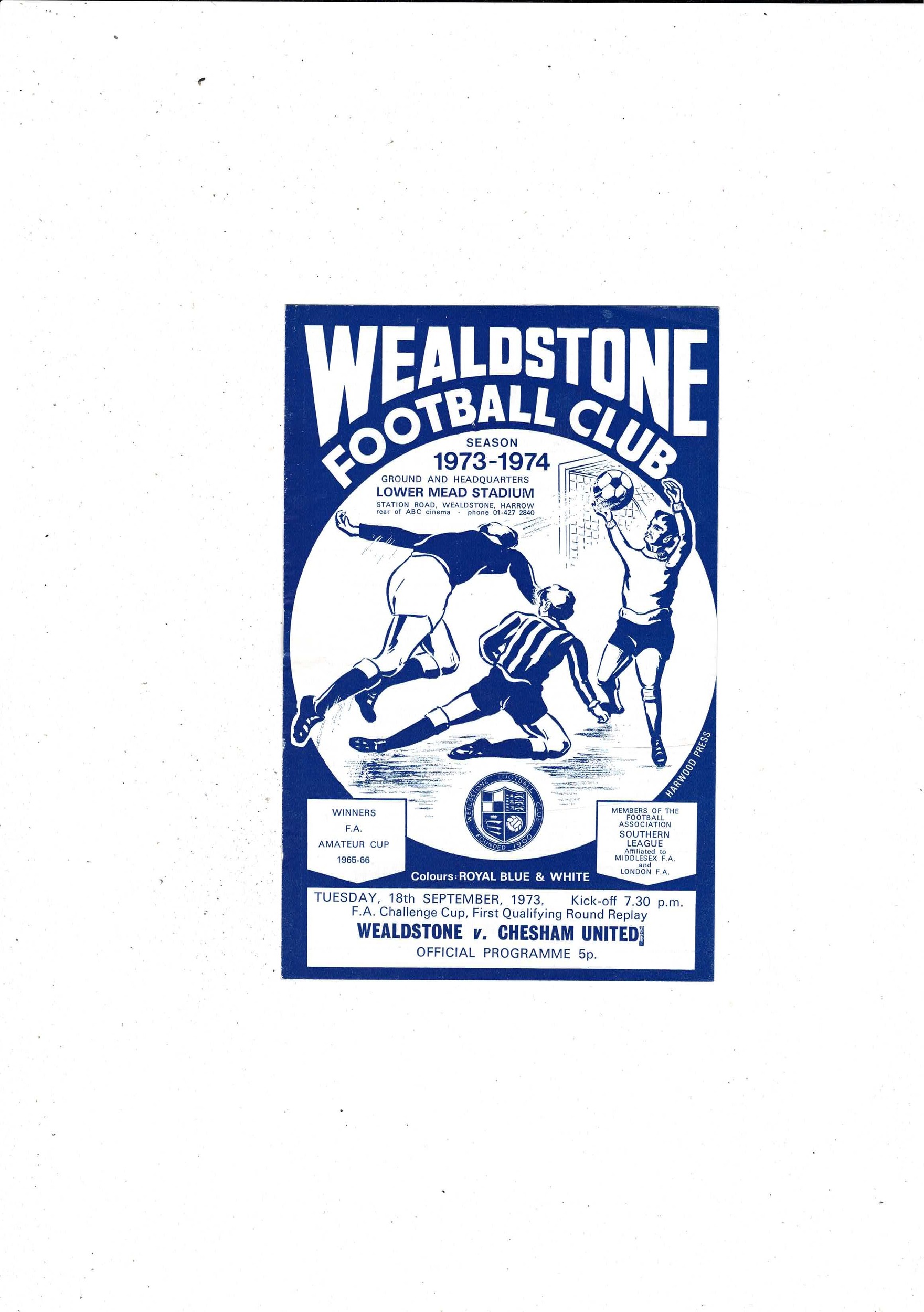 Wealdstone v Chesham United FA Cup Replay Football Programme 1973/74