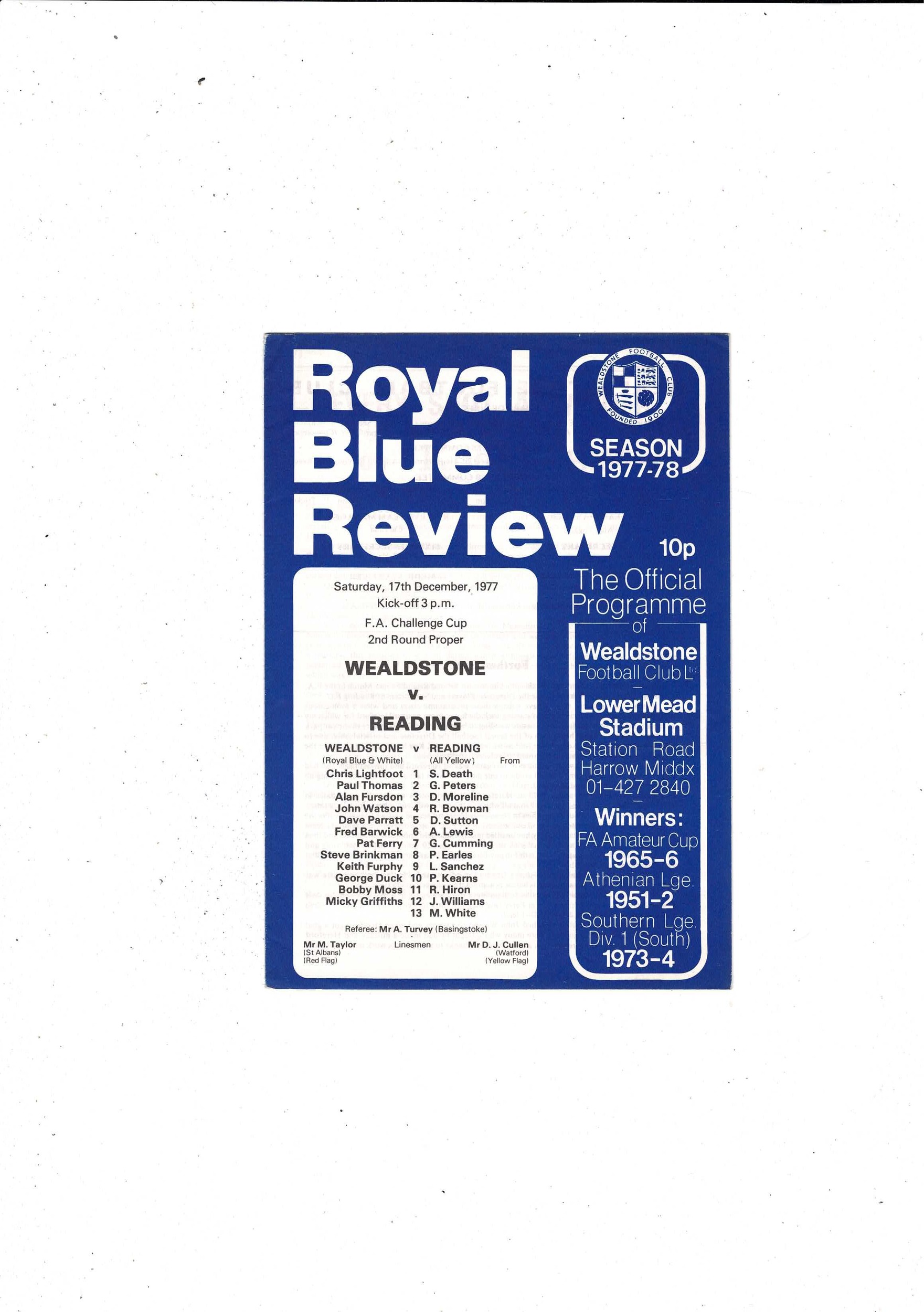 Wealdstone v Reading FA Cup Football Programme 1977/78