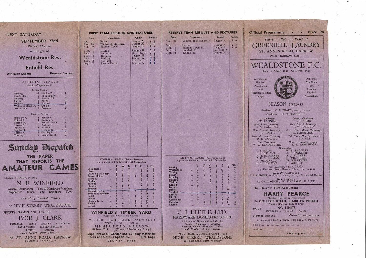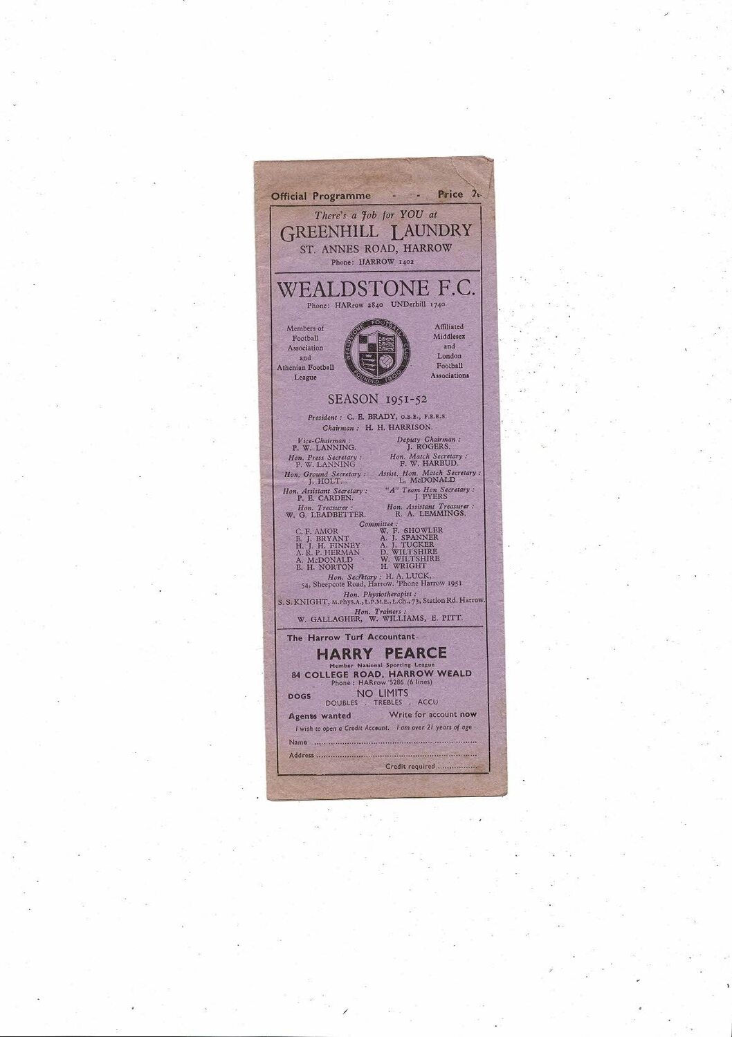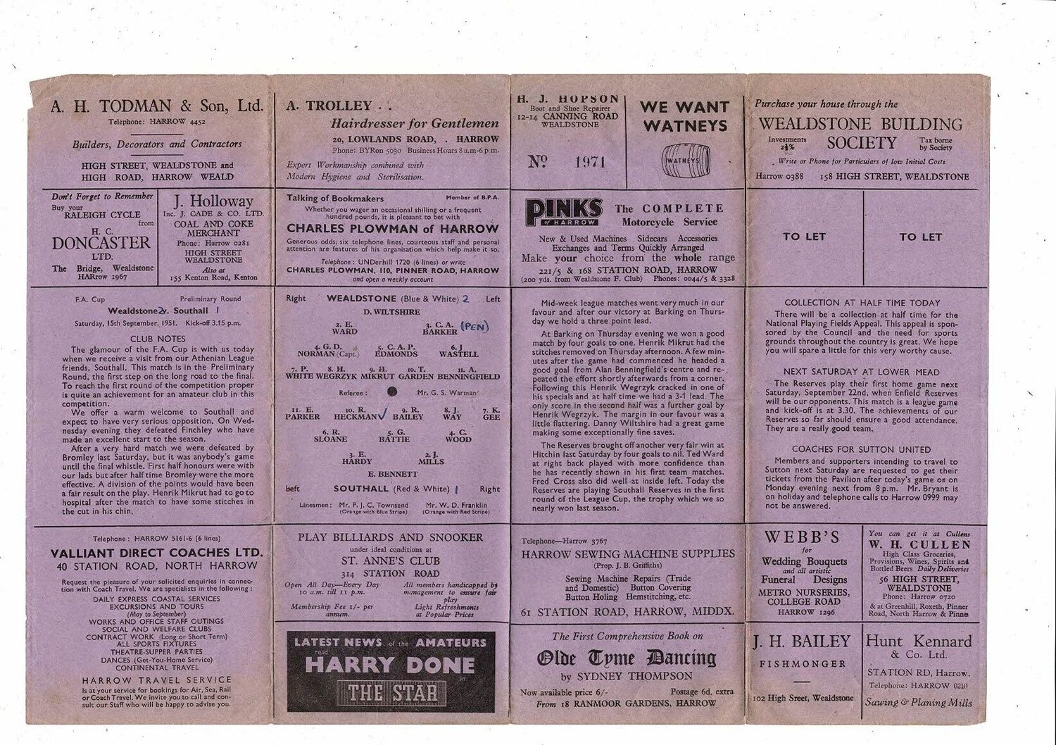 Wealdstone v Southall FA Cup Football Programme 1951/52