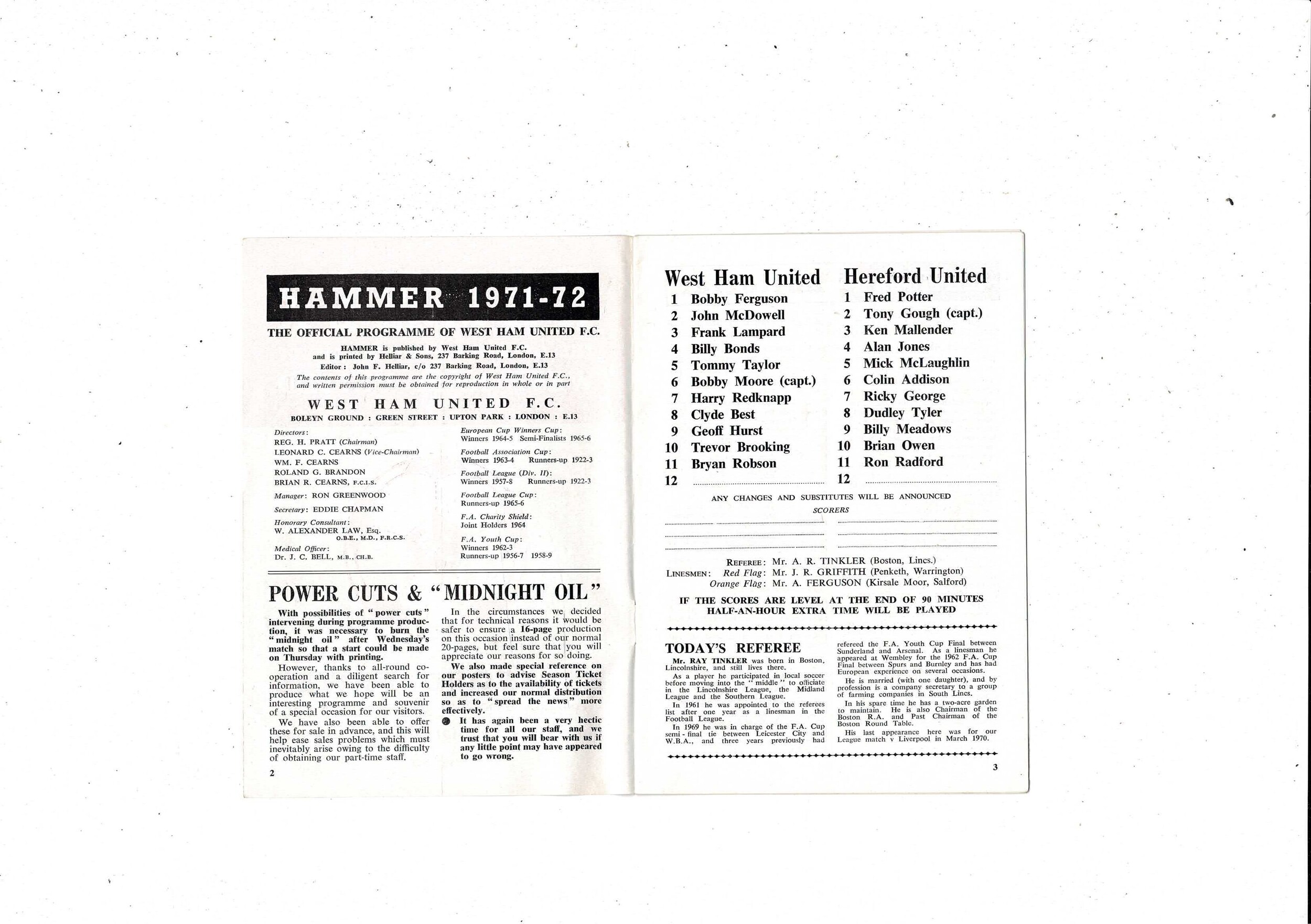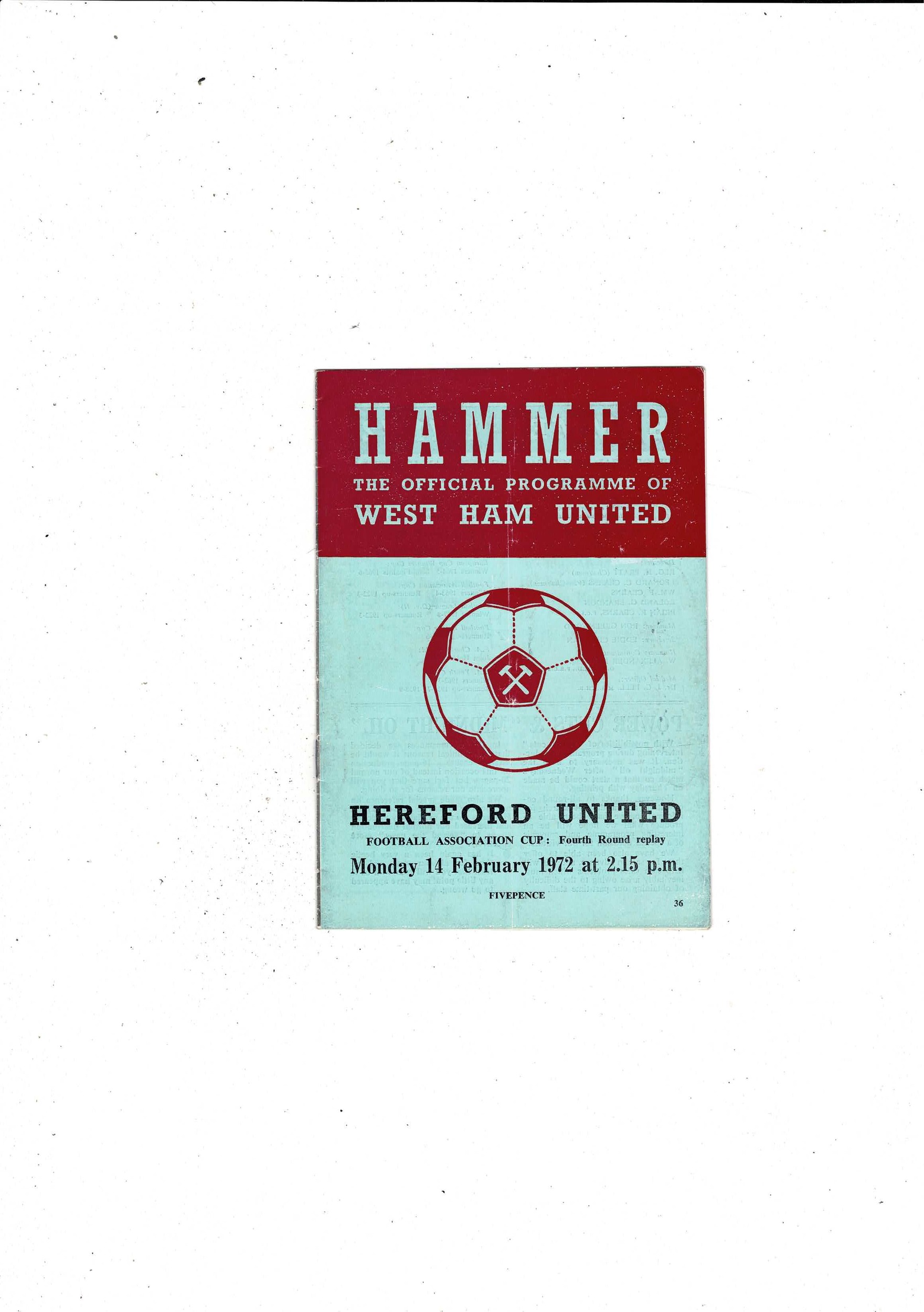 West Ham United v Hereford United FA Cup Replay Football Programme 1971/72