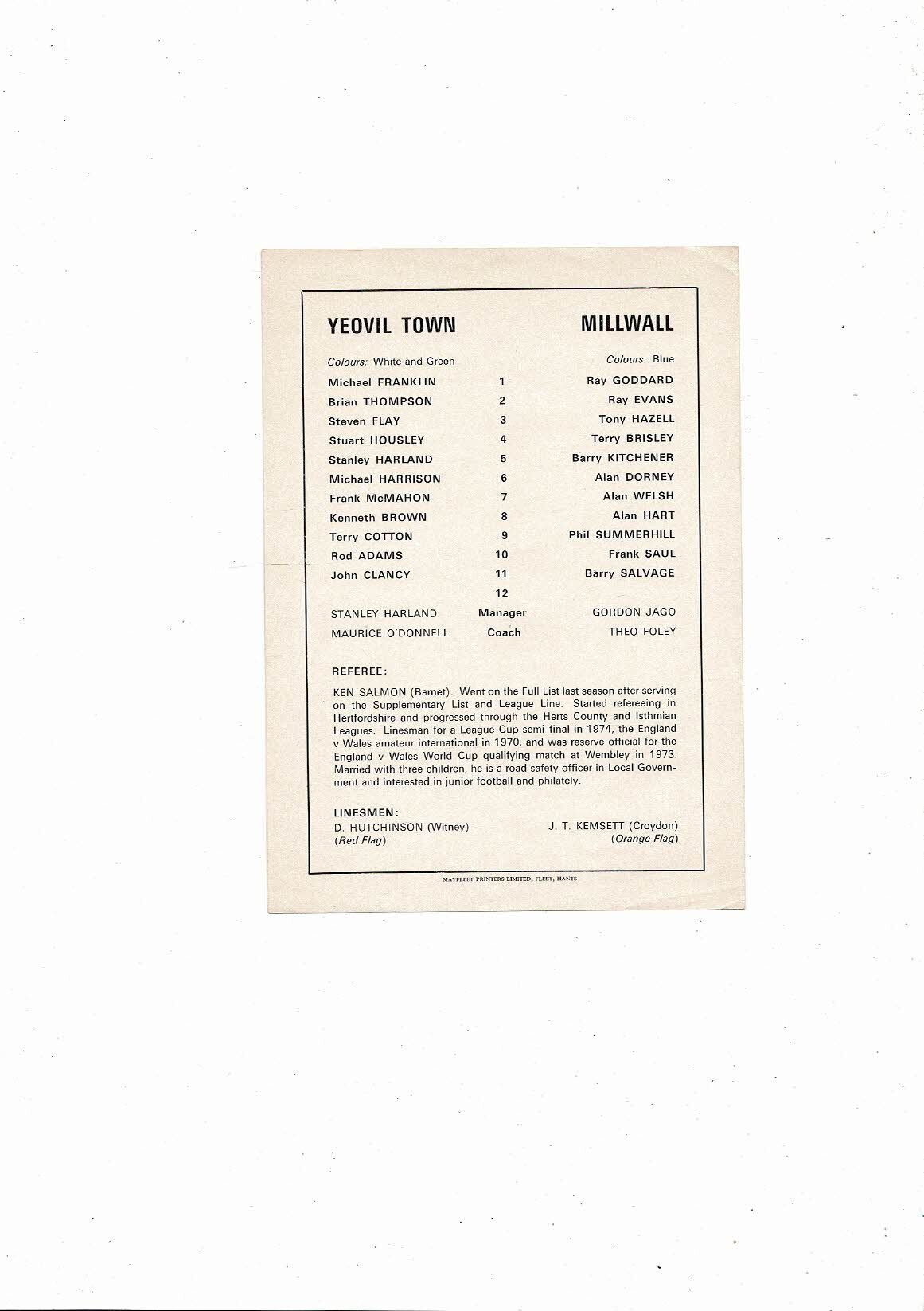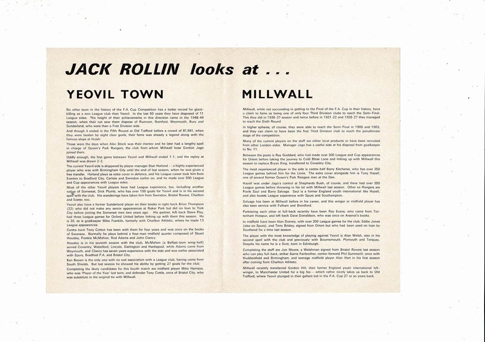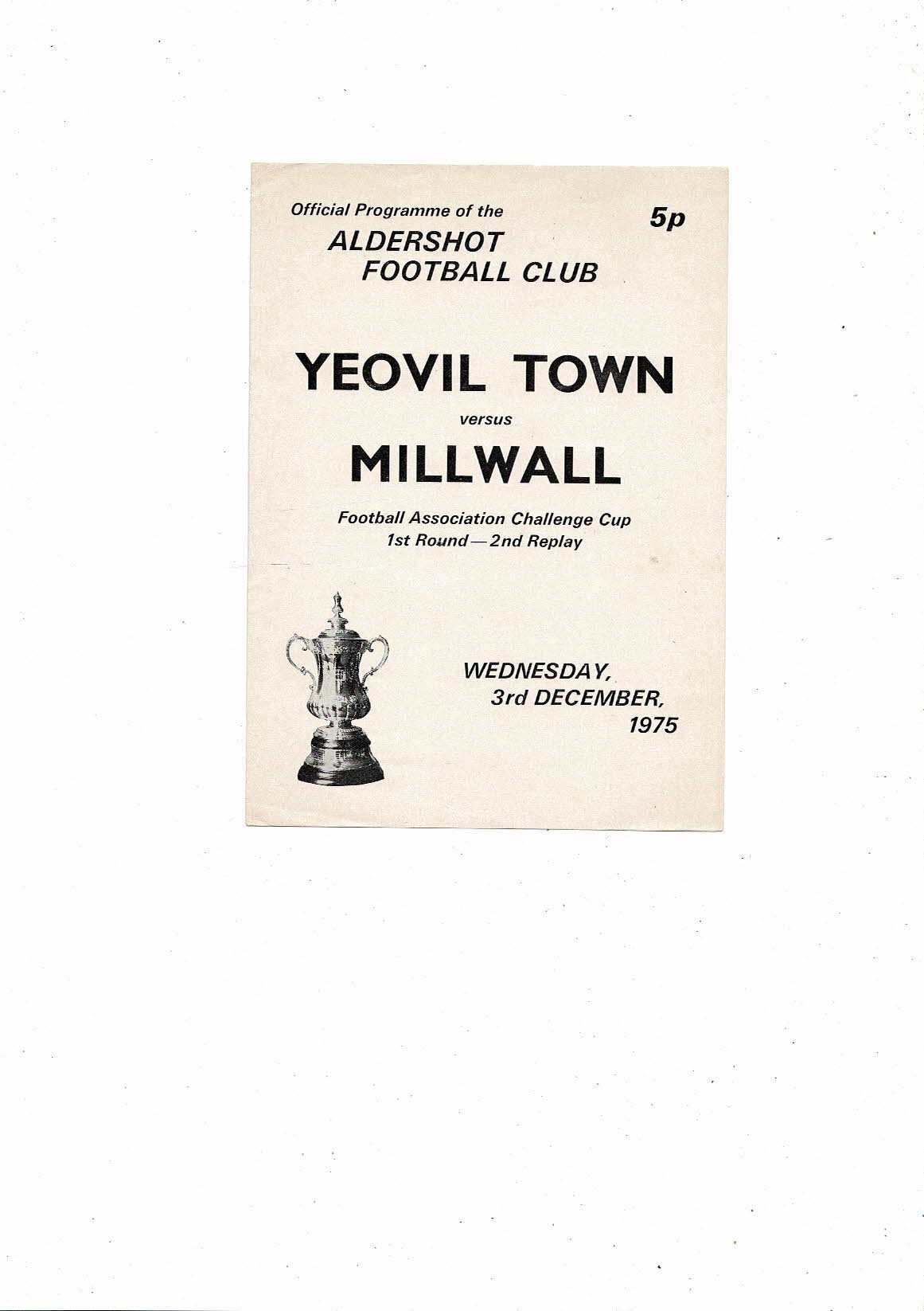 Yeovil Town v Millwall FA Cup 1st Round 2nd Replay Football Programme 1975/76 @ Aldershot