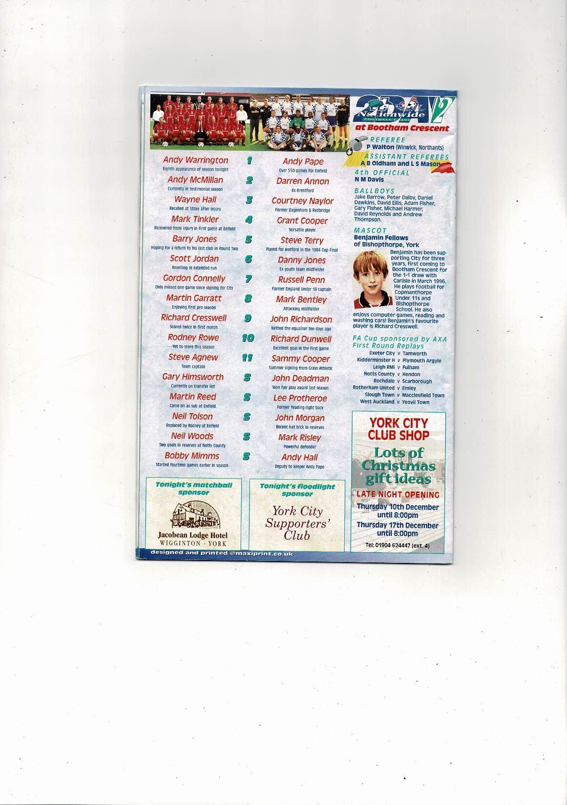 York City v Enfield FA Cup Football Programme 1998/99