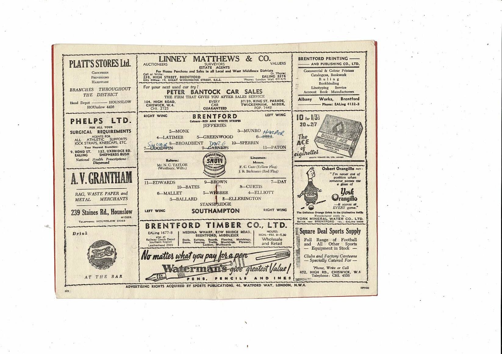 1950/51 Brentford v Southampton Football Programme