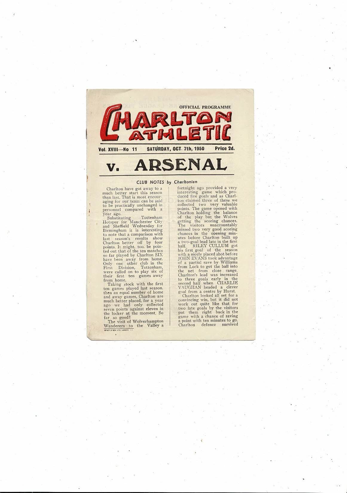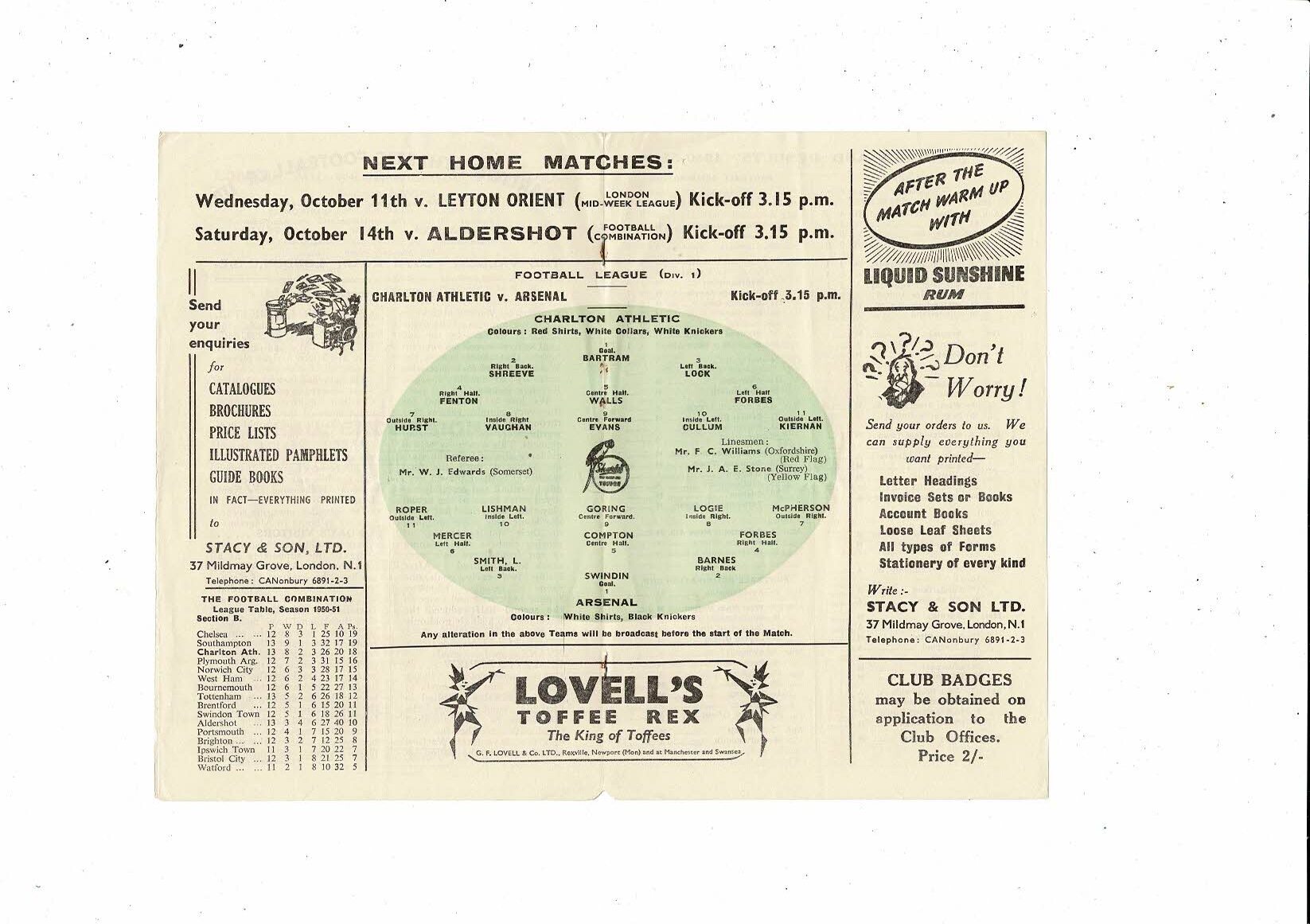 1950/51 Charlton Athletic v Arsenal Football Programme