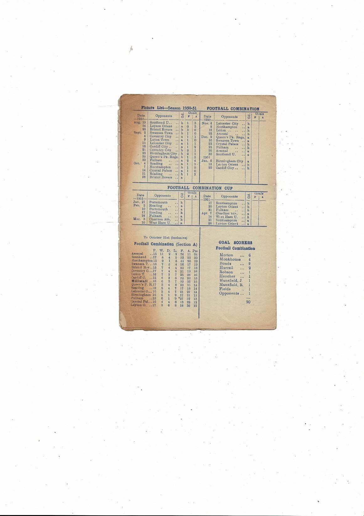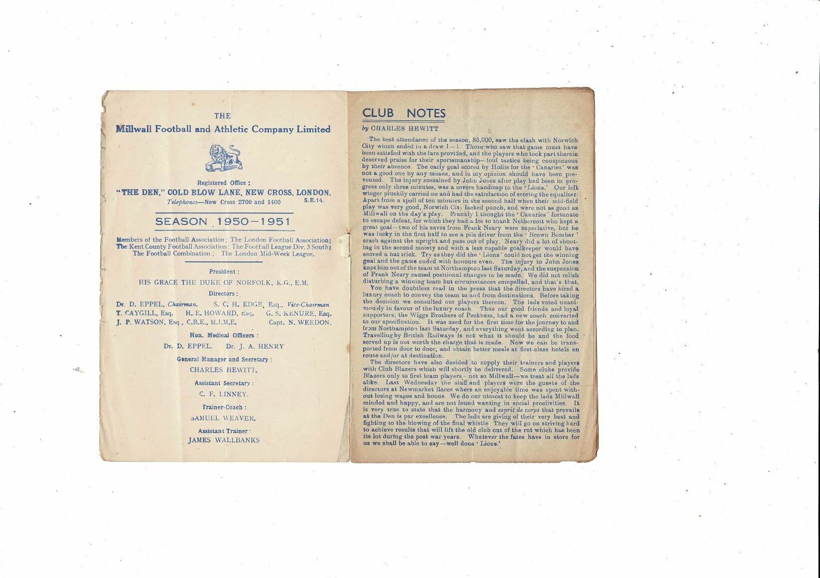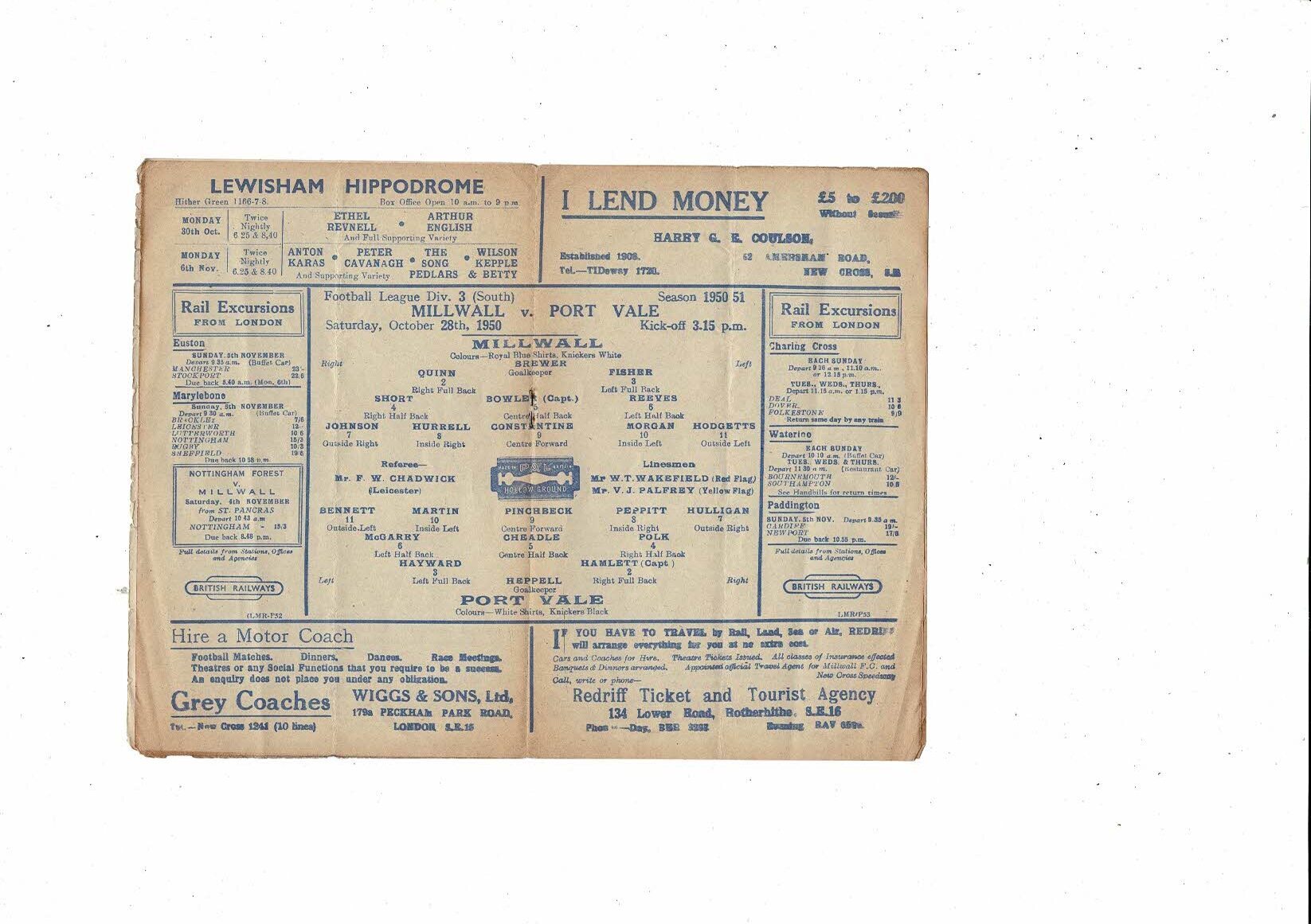 1950/51 Millwall v Port Vale Football Programme