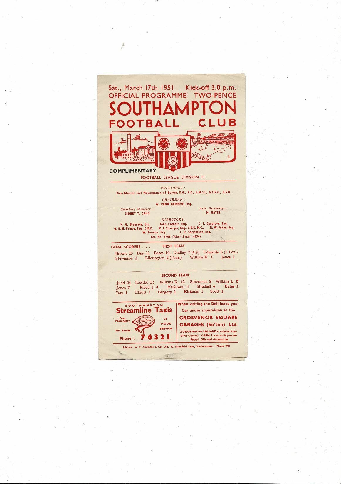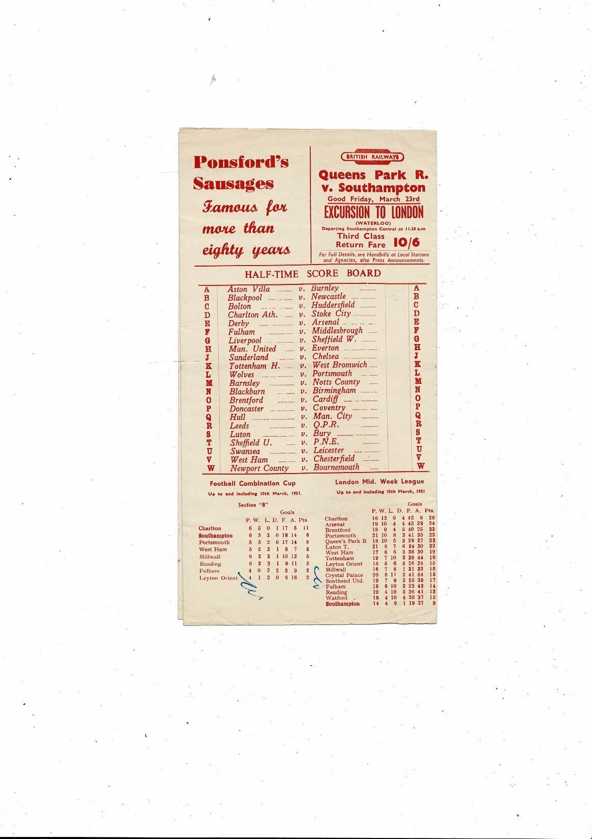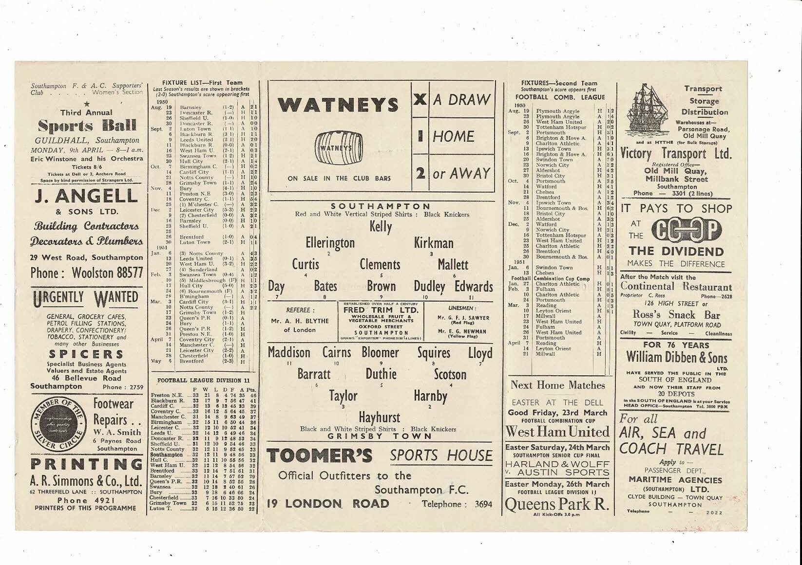 1950/51 Southampton v Grimsby Town Football Programme