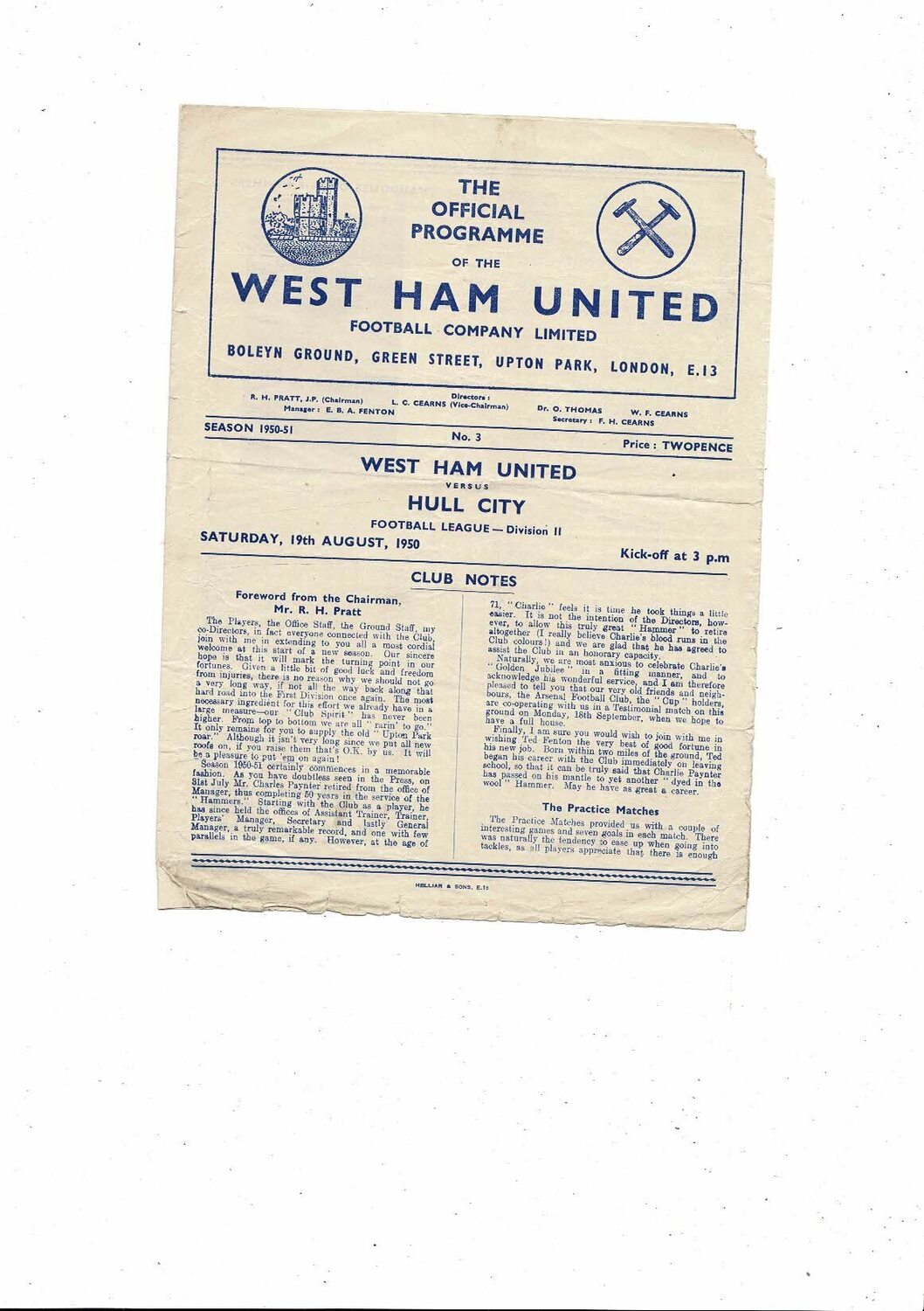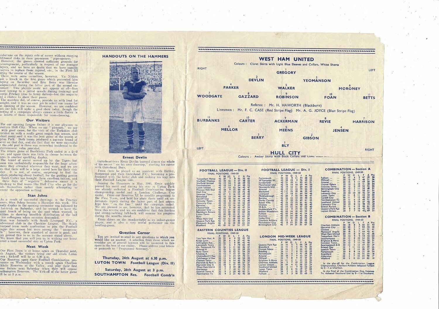 1950/51 West Ham United v Hull City Football Programme