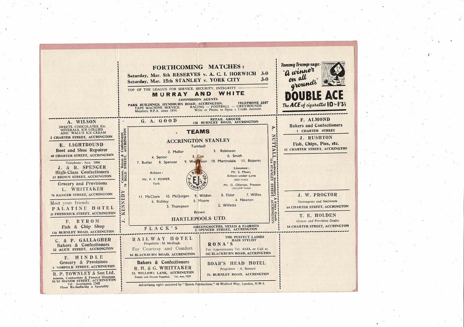 1951/52 Accrington Stanley v Hartlepool United Football Programme