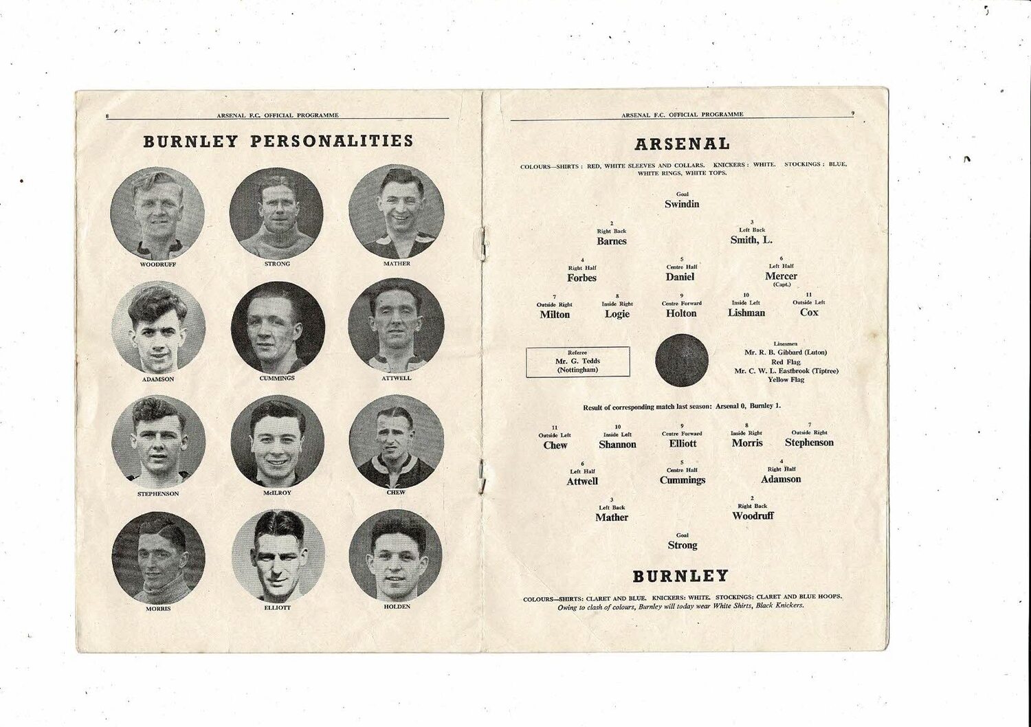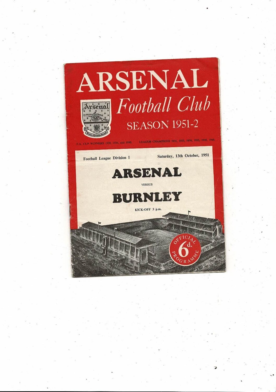 1951/52 Arsenal v Burnley Football Programme