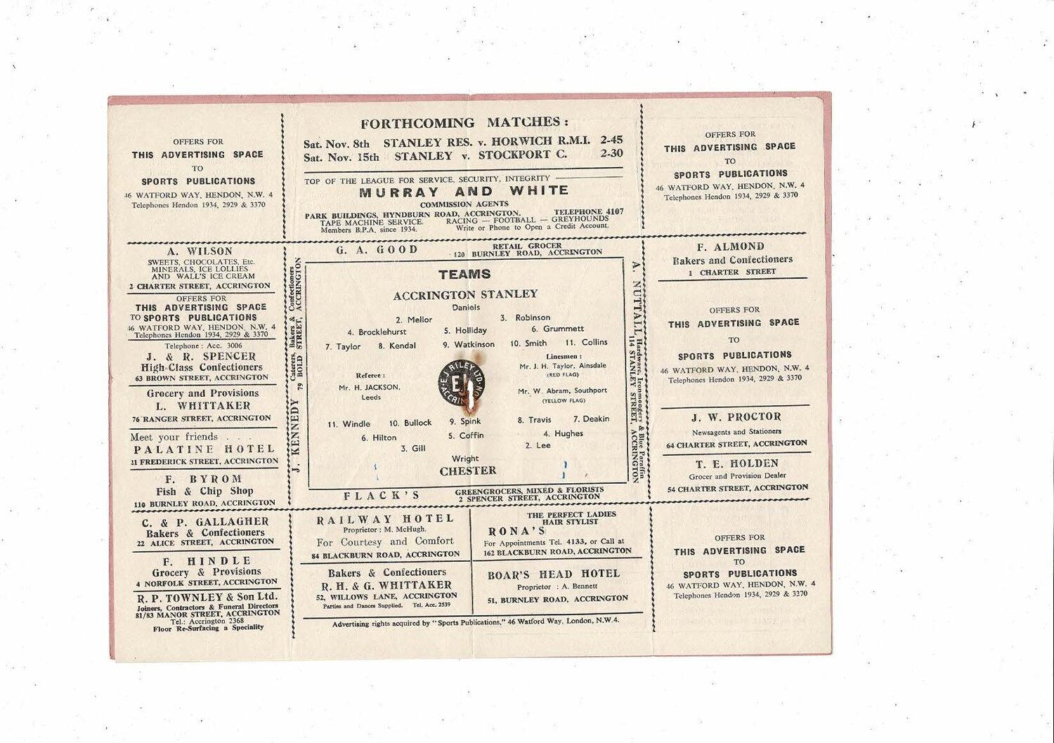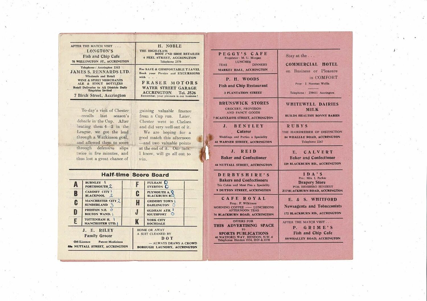 1952/53 Accrington Stanley v Chester Football Programme November 1st