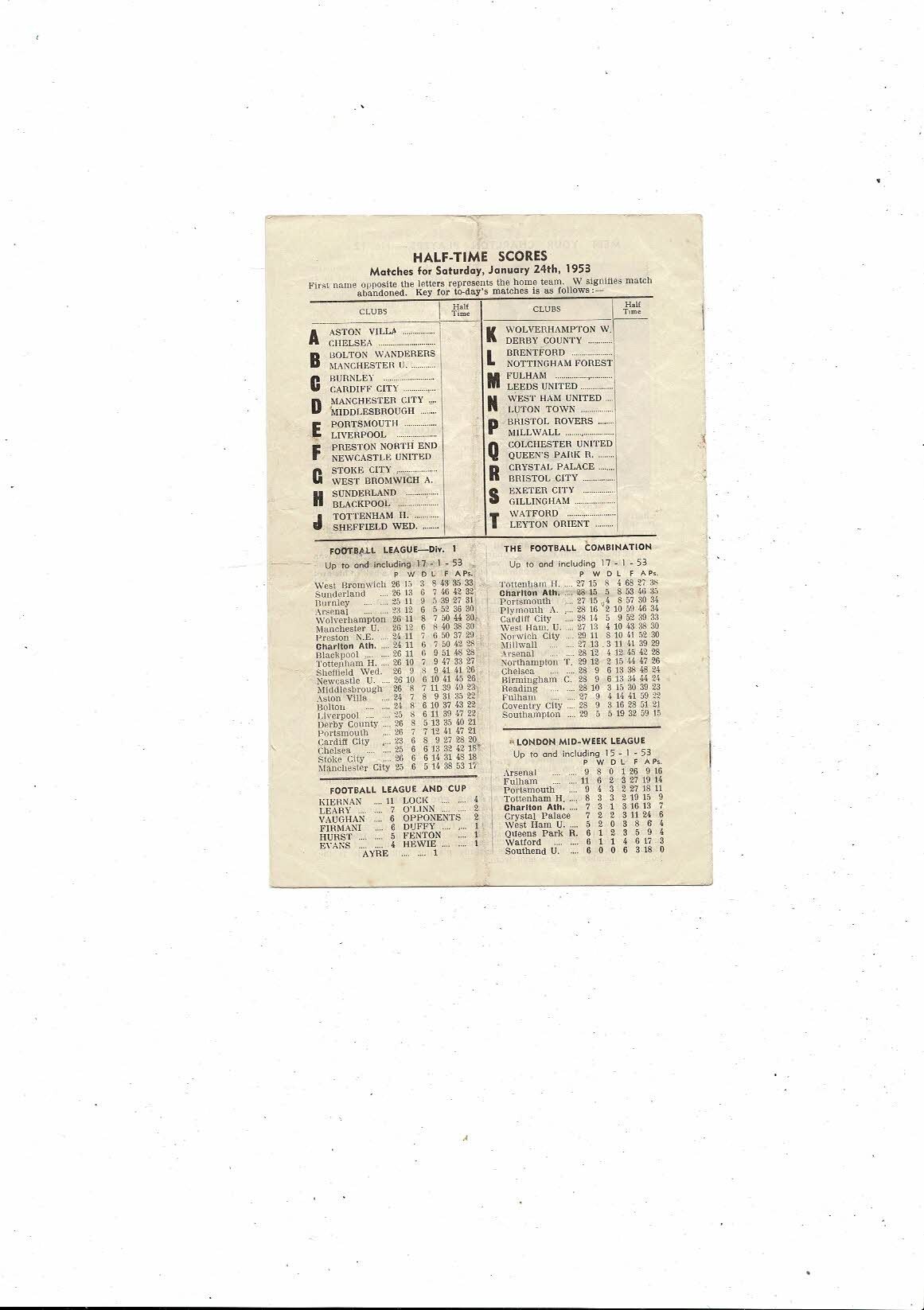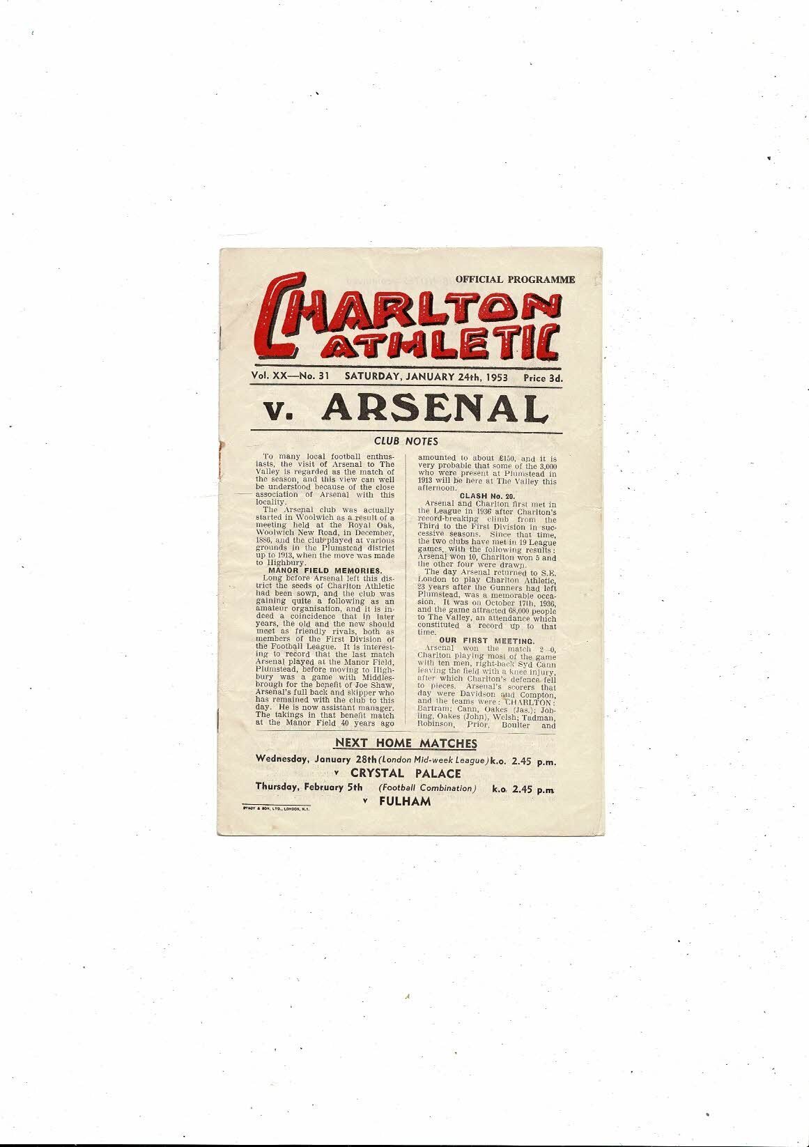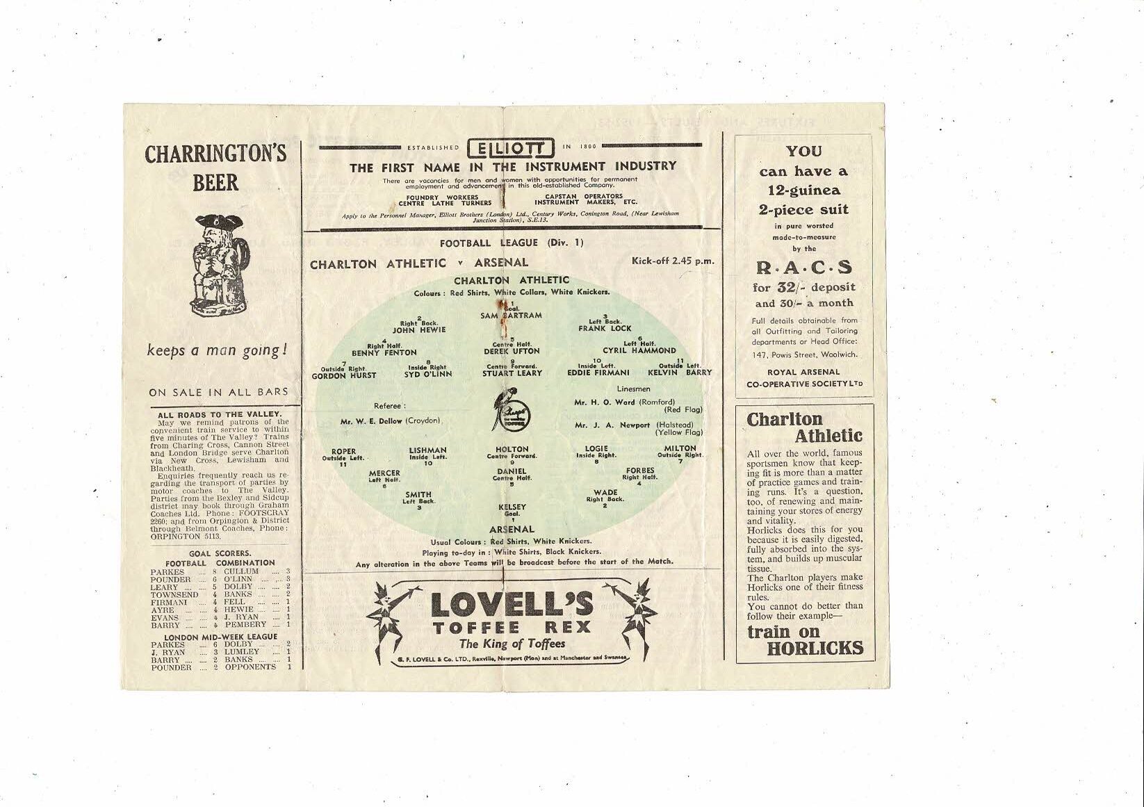 1952/53 Charlton Athletic v Arsenal Football Programme
