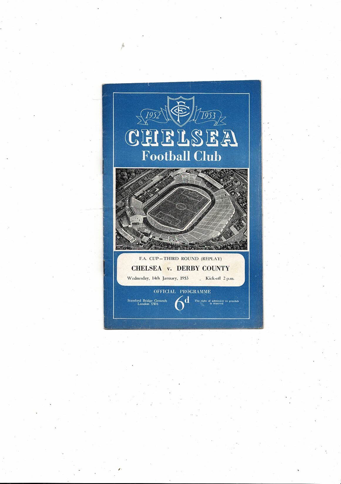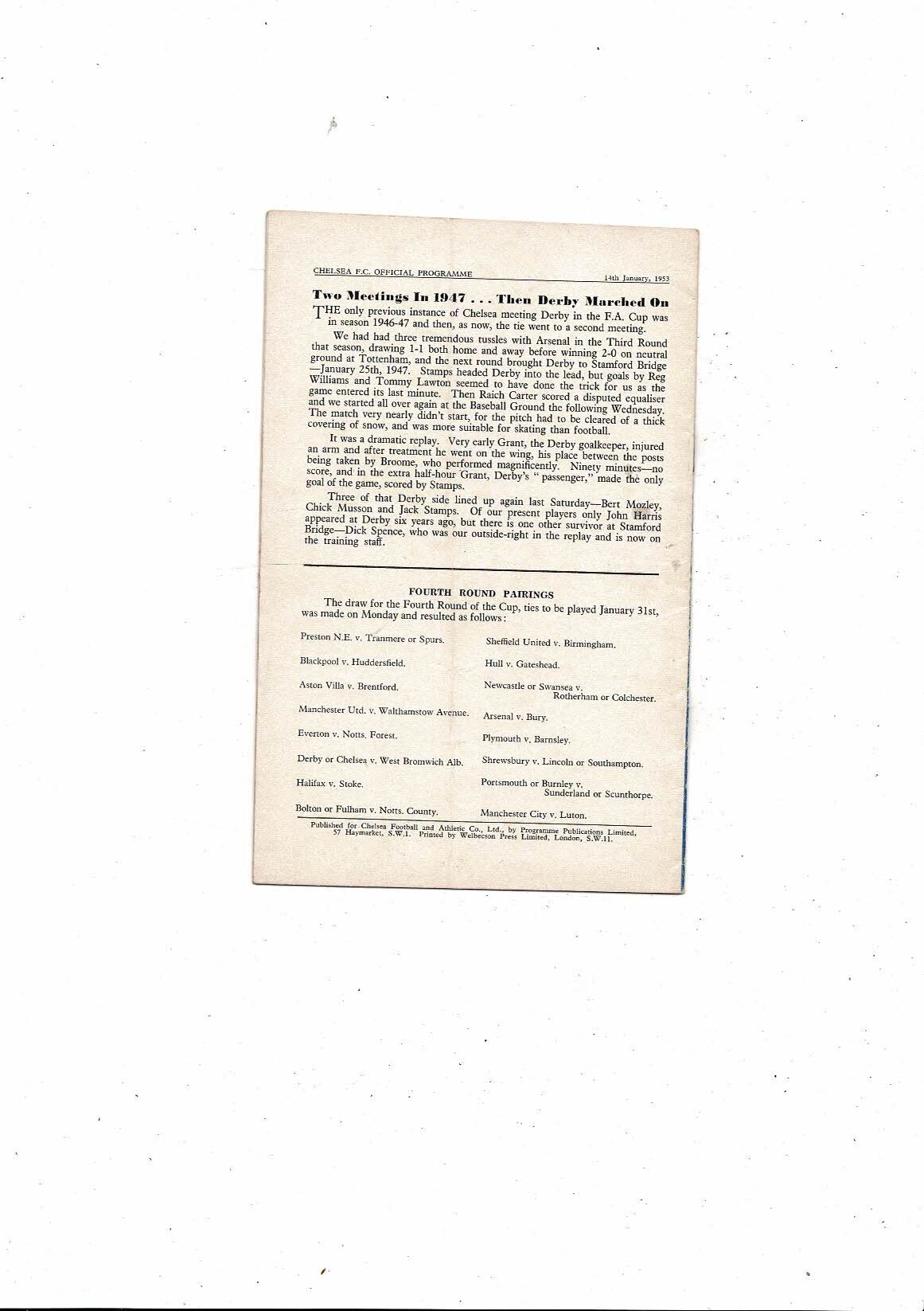 1952/53 Chelsea v Derby County FA Cup Replay Football Programme
