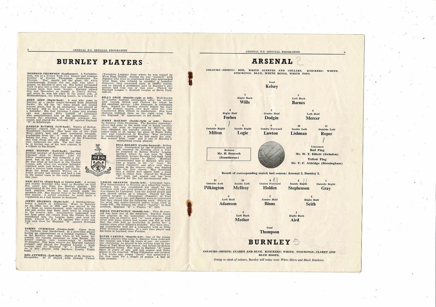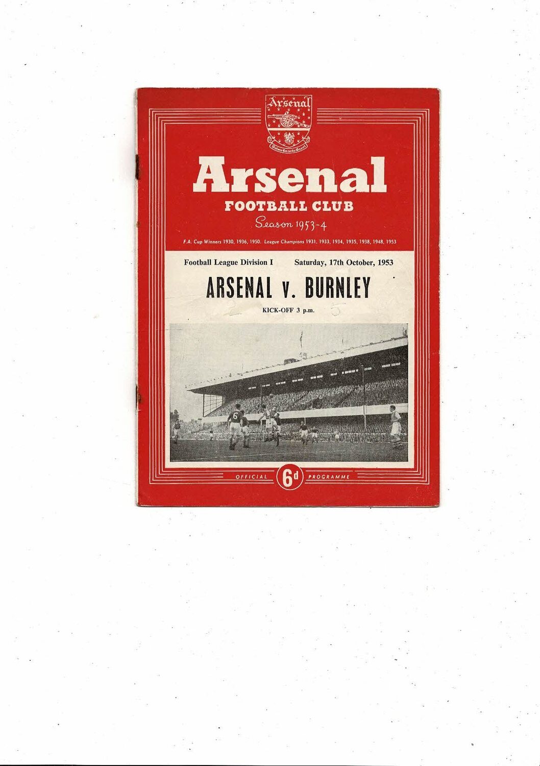 1953/54 Arsenal v Burnley Football Programme
