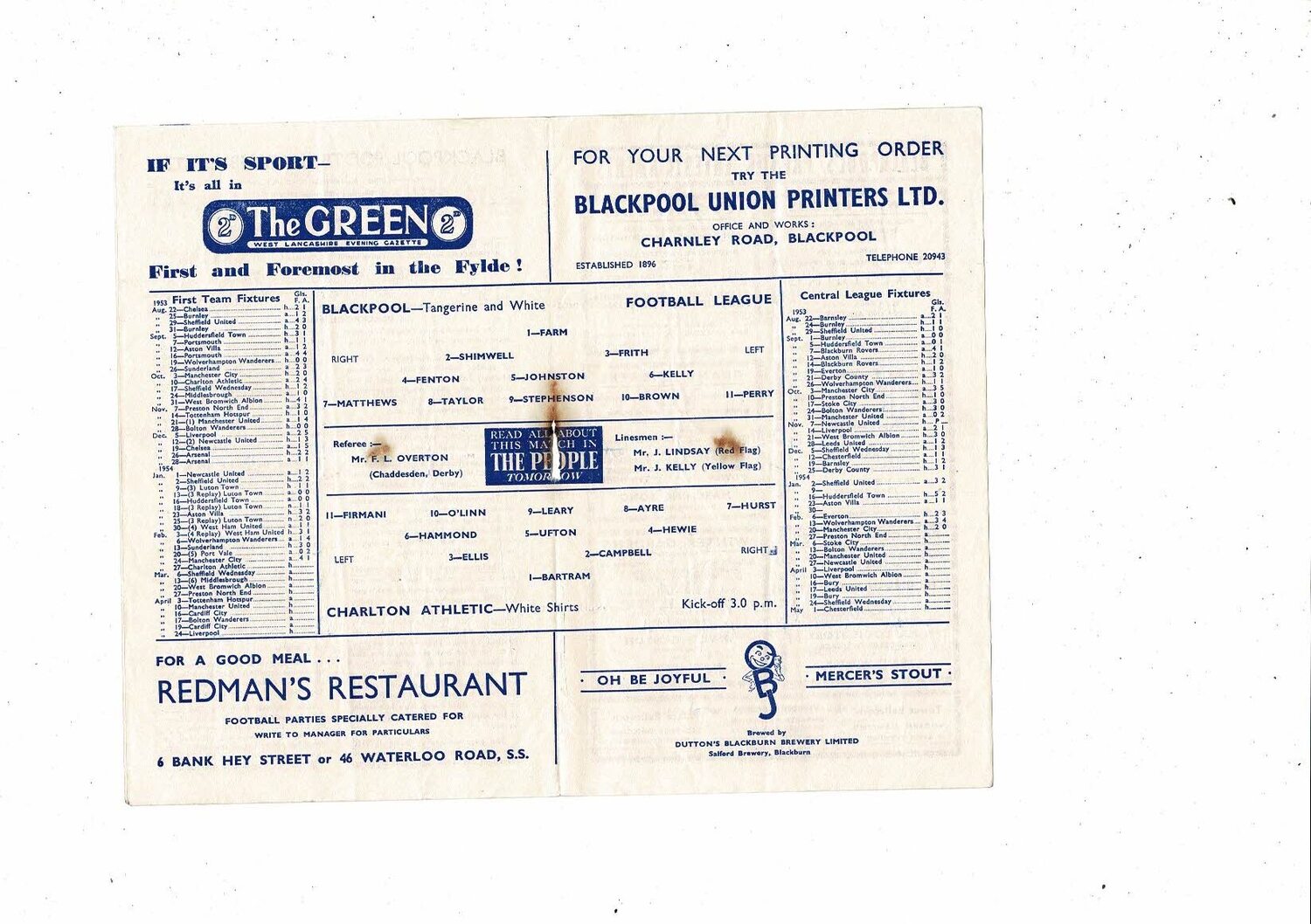 1953/54 Blackpool v Charlton Athletic Football Programme
