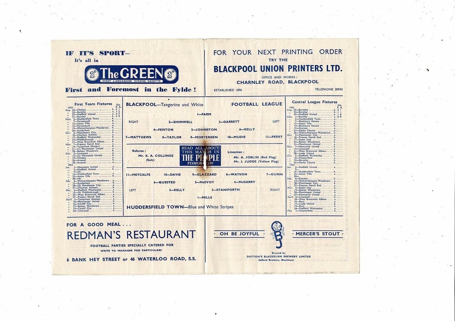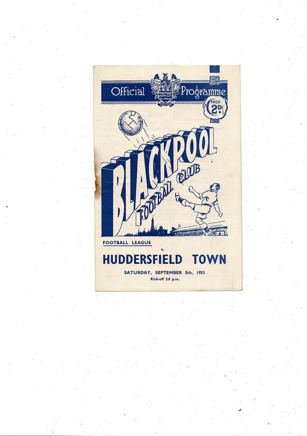 1953/54 Blackpool v Huddersfield Town Football Programme