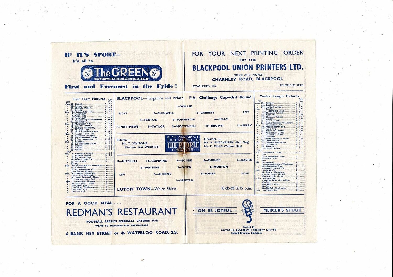1953/54 Blackpool v Luton FA Cup Football Programme