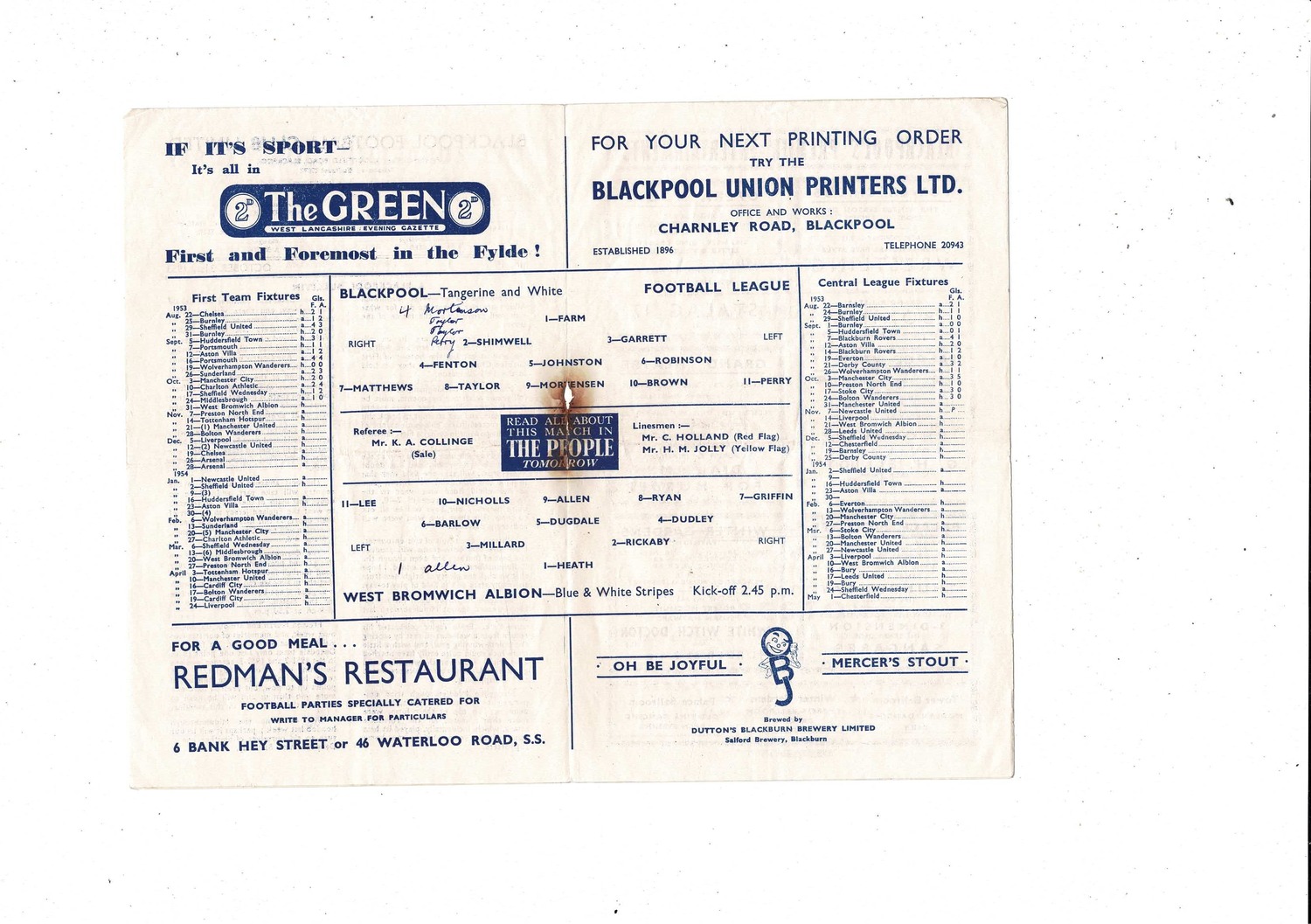 1953/54 Blackpool v Sheffield Wednesday Football Programme