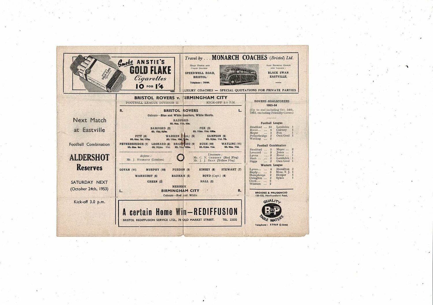 1953/54 Bristol Rovers v Birmingham City Football Programme