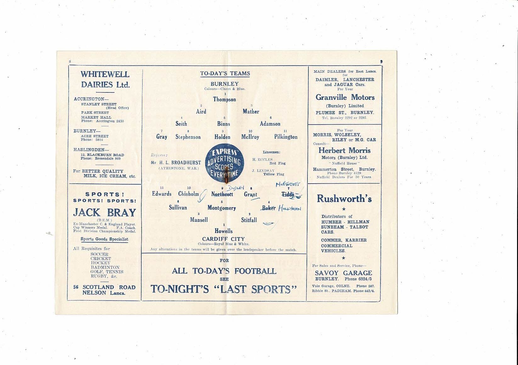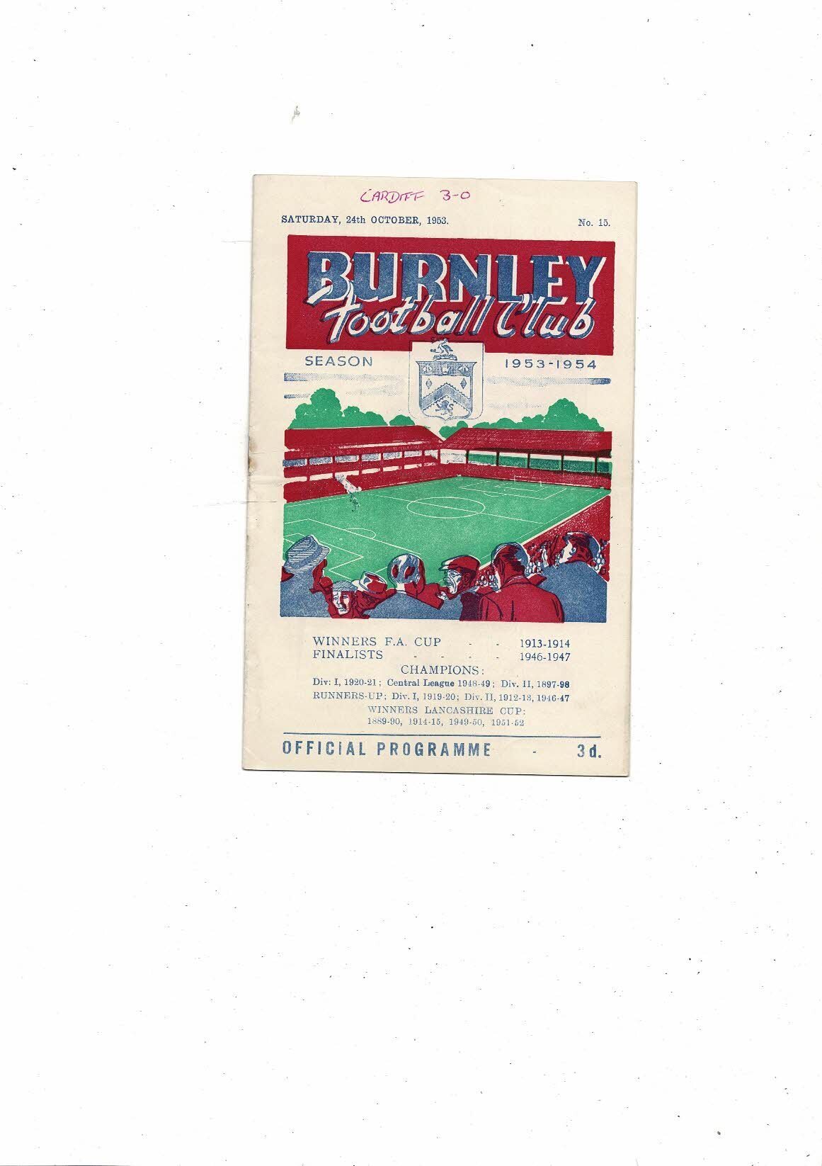 1953/54 Burnley v Cardiff City Football Programme