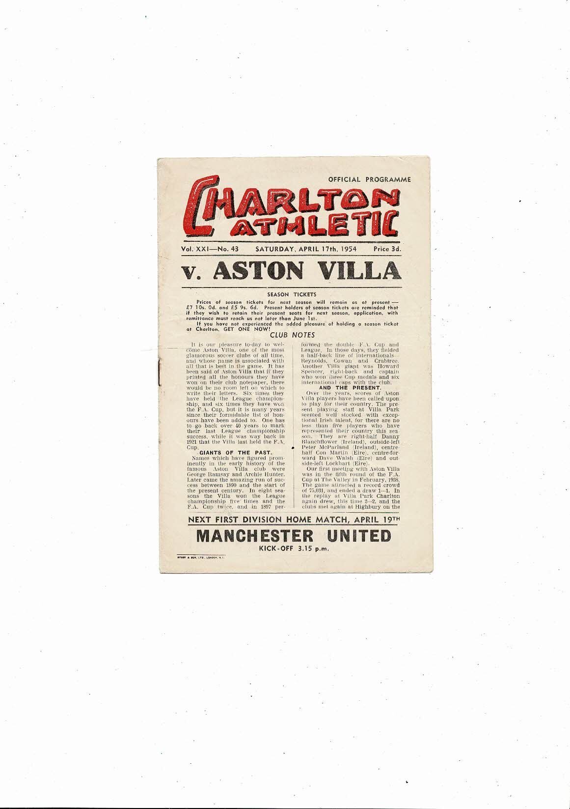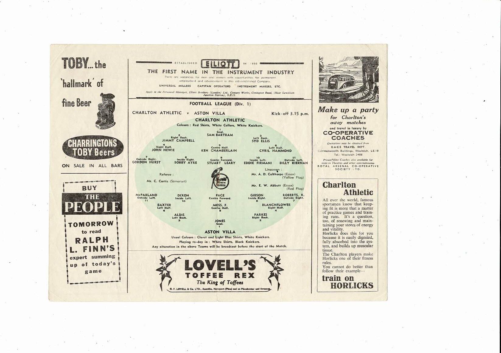 1953/54 Charlton Athletic v Aston Villa Football Programme