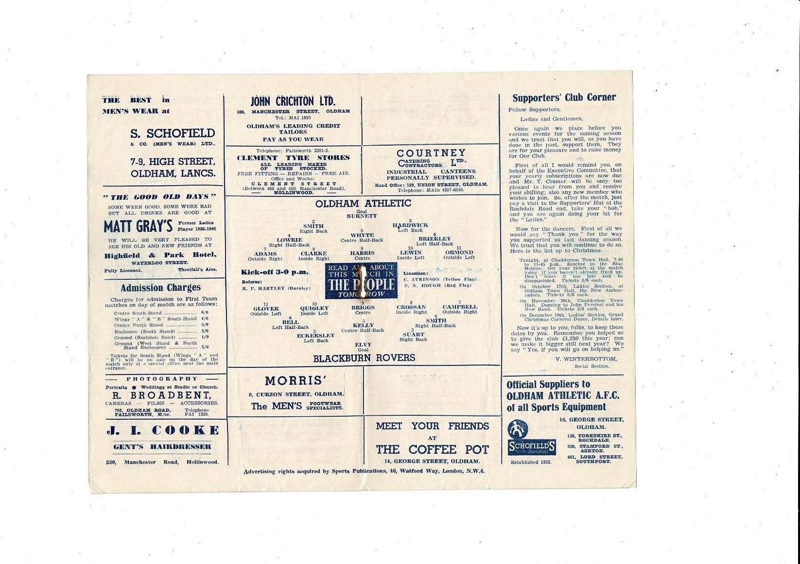 1953/54 Oldham Athletic v Blackburn Rovers Football Programme