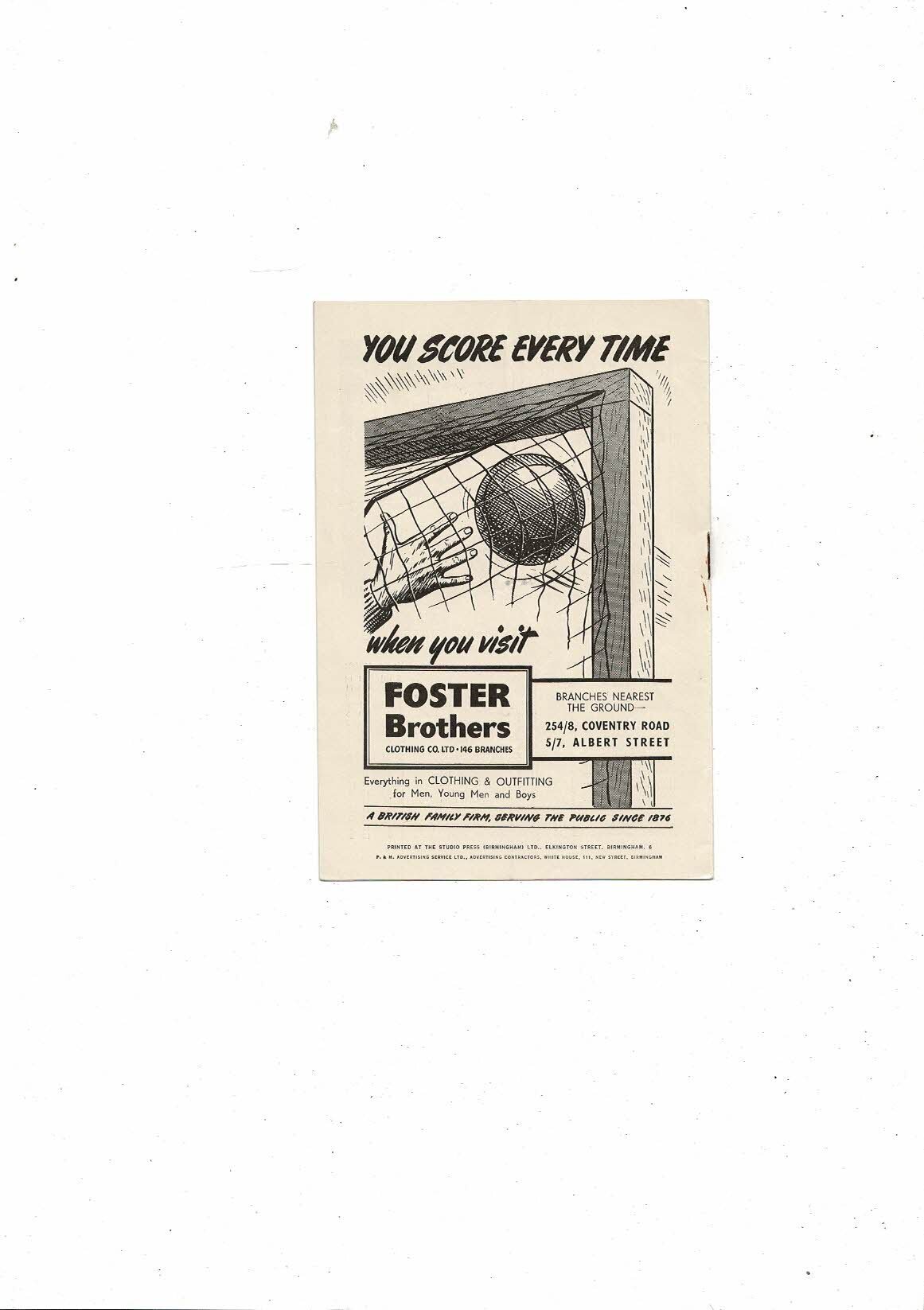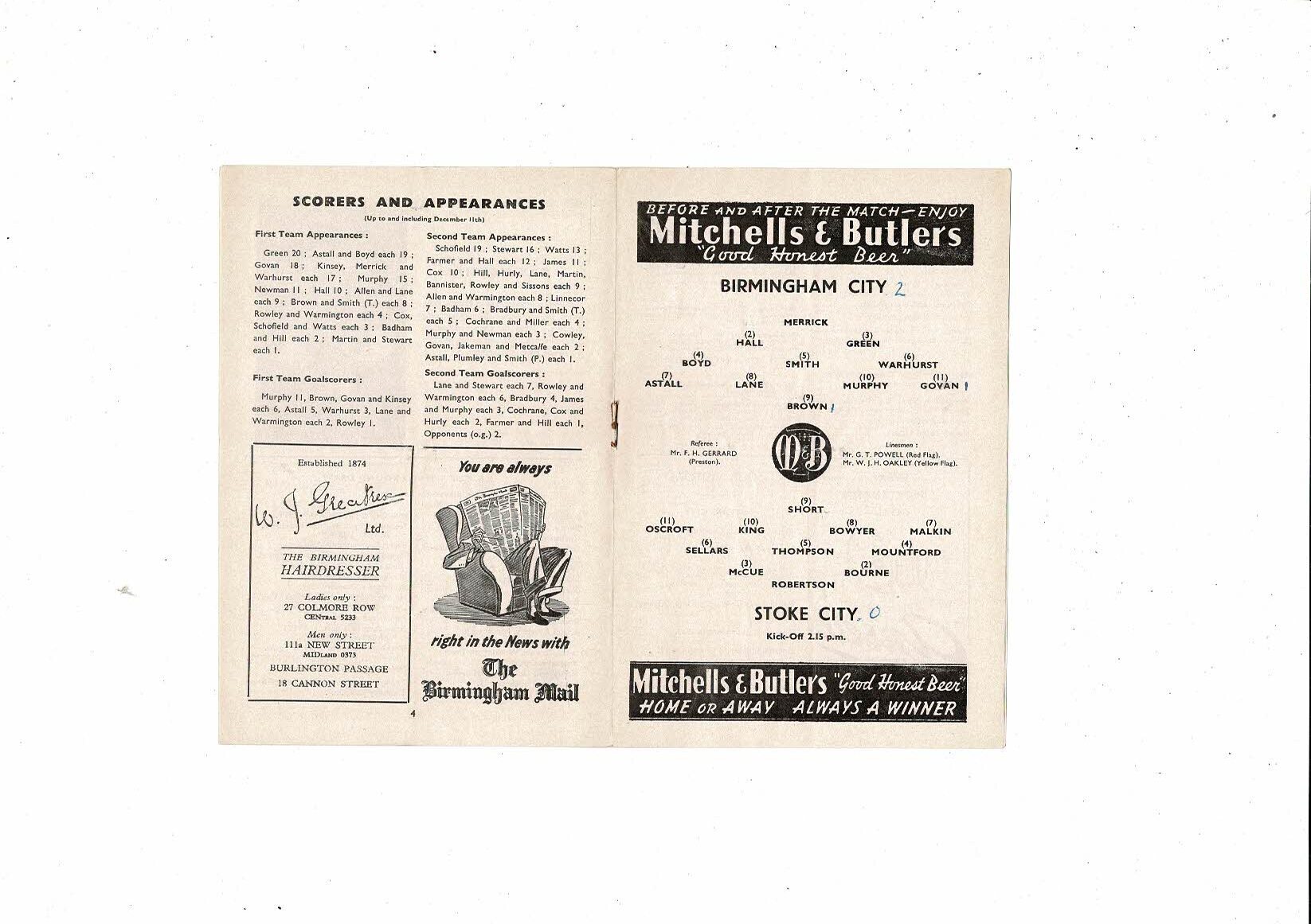 1954/55 Birmingham City v Stoke City Football Programme