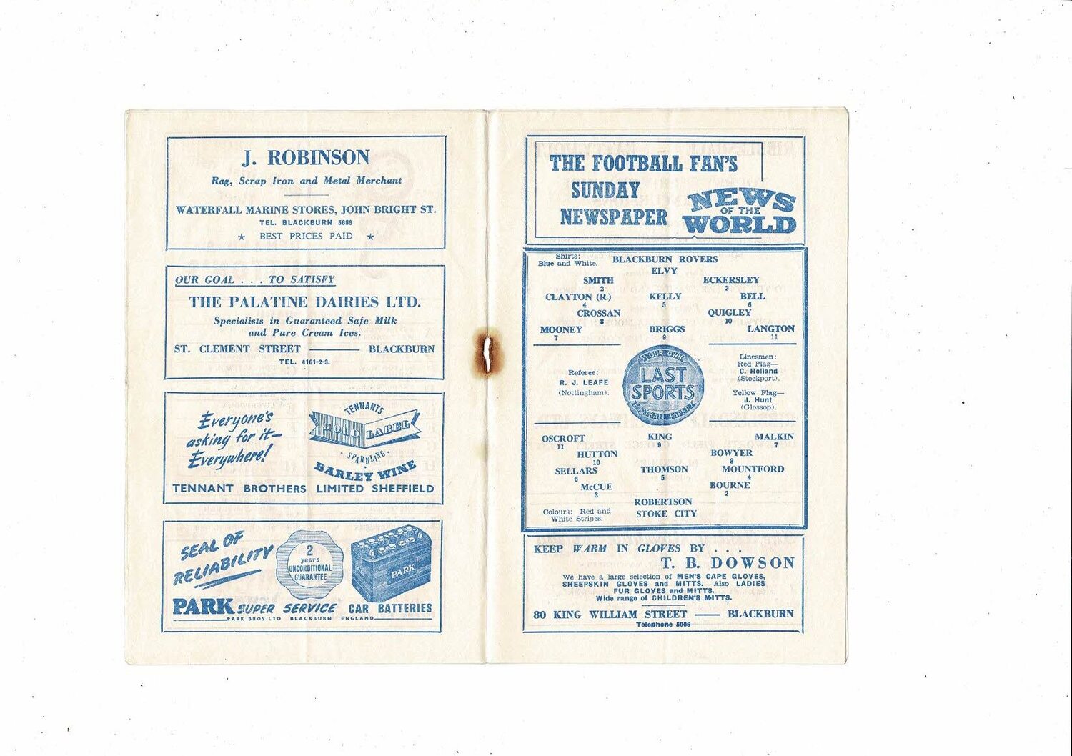 1954/55 Blackburn Rovers v Stoke City Football Programme