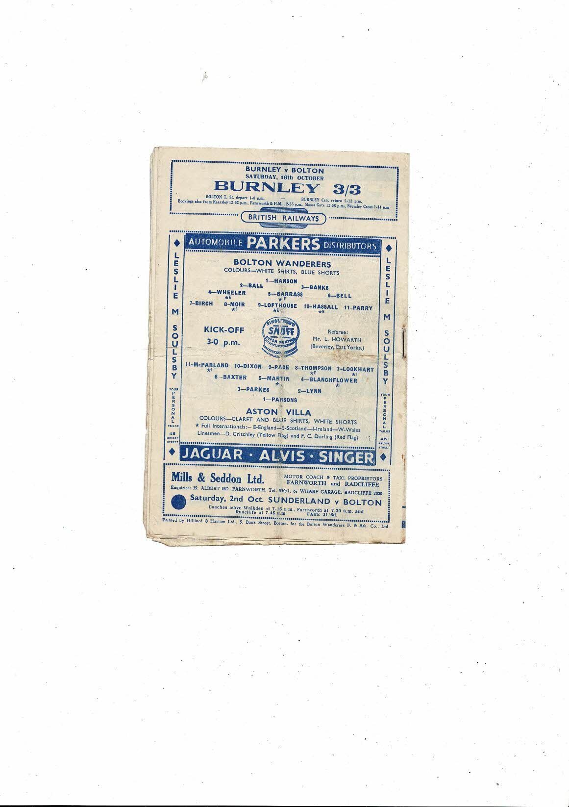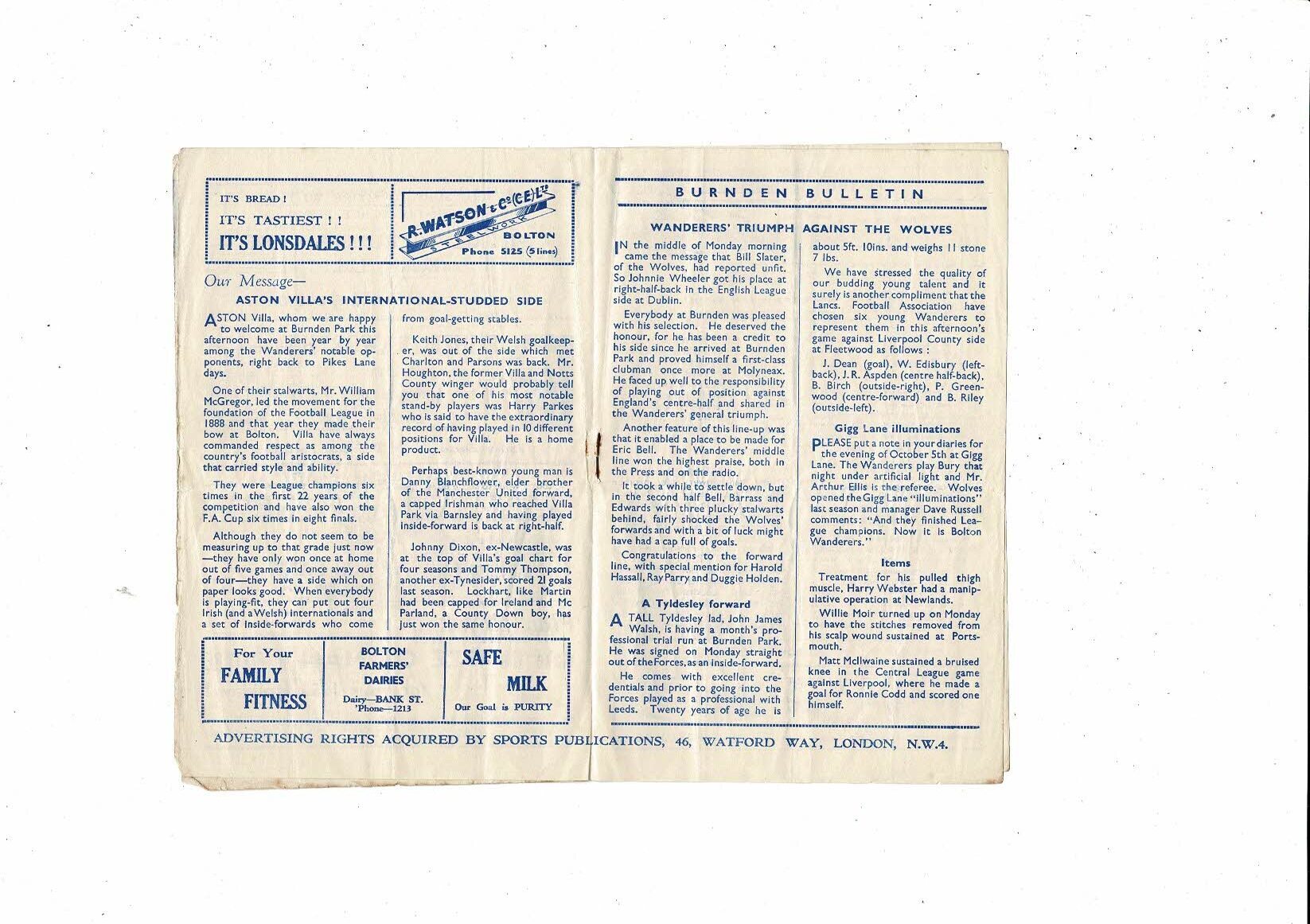 1954/55 Bolton Wanderers v Aston Villa Football Programme
