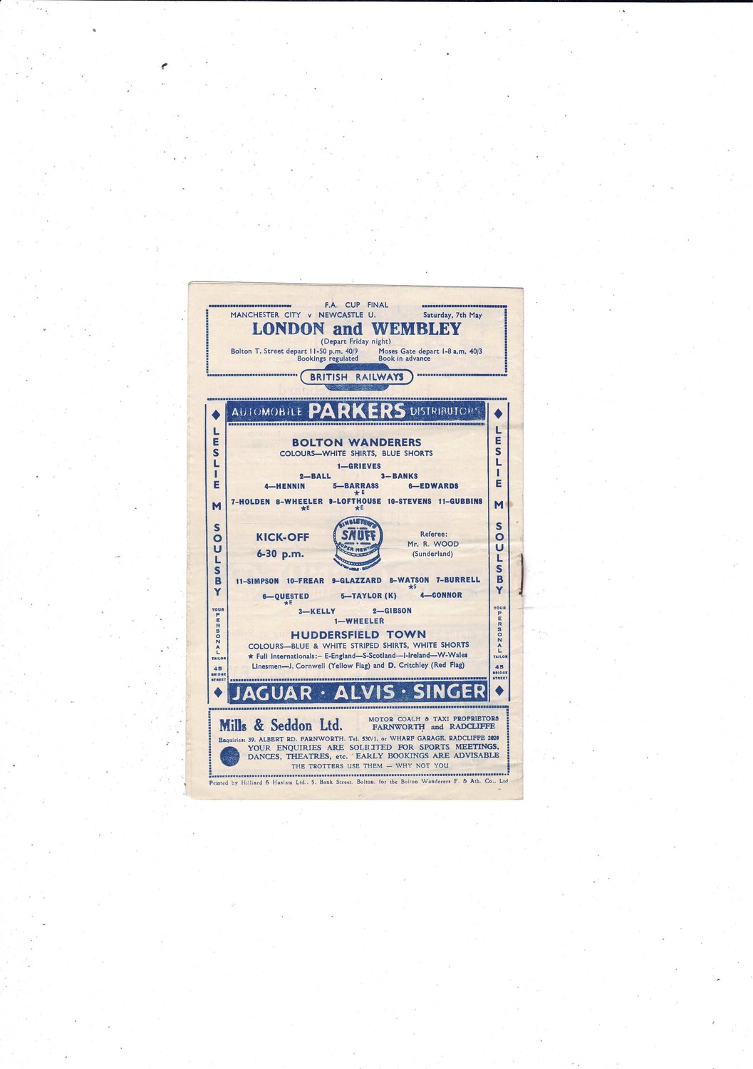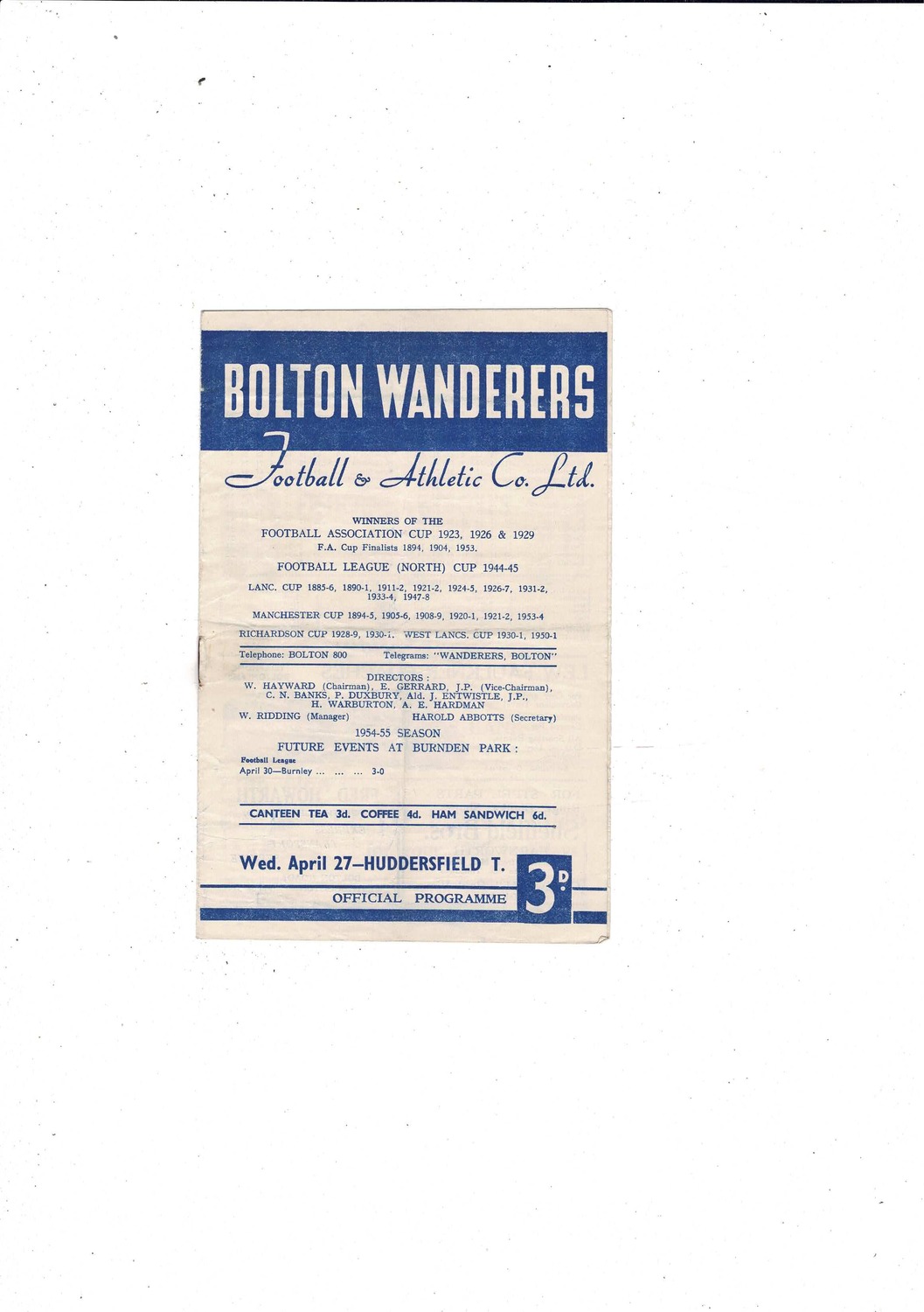 1954/55 Bolton Wanderers v Huddersfield Town Football Programme