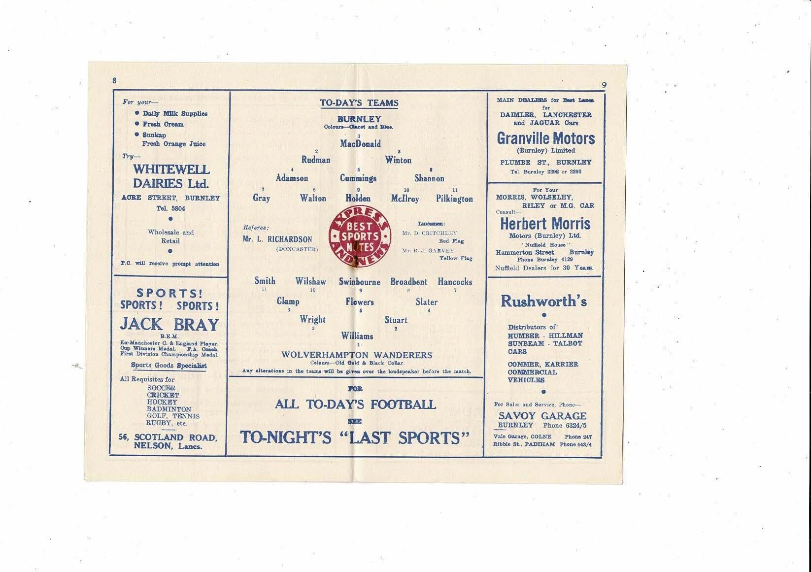 1954/55 Burnley v Wolverhampton Wanderers Football Programme