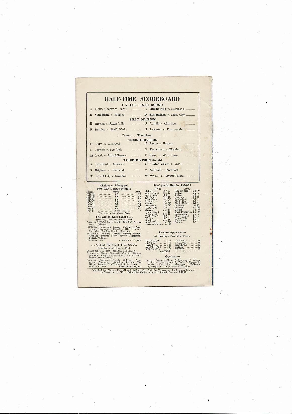 1954/55 Chelsea v Blackpool Championship Season Football Programme