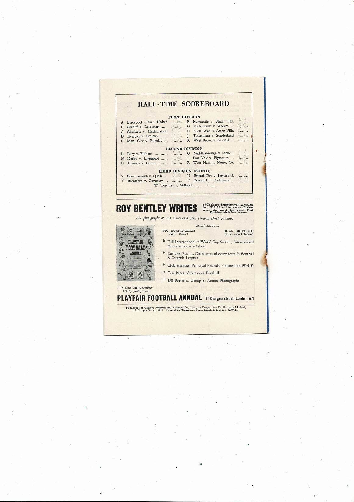 1954/55 Chelsea v Bolton Wanderers Championship Season Football Programme