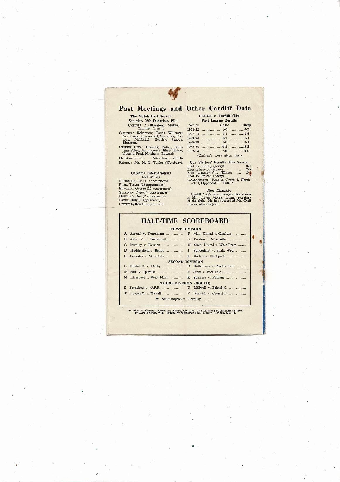 1954/55 Chelsea v Cardiff City Championship Season Football Programme