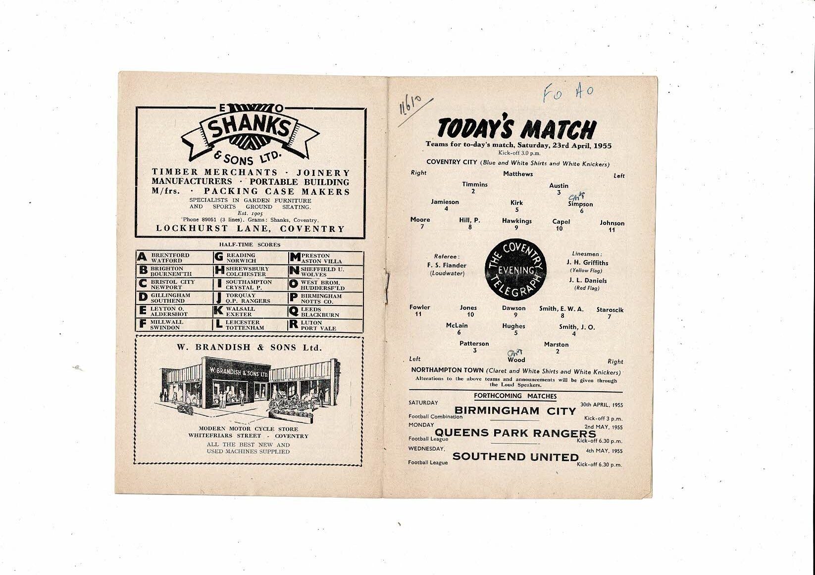 1954/55 Coventry City v Northampton Town Football Programme