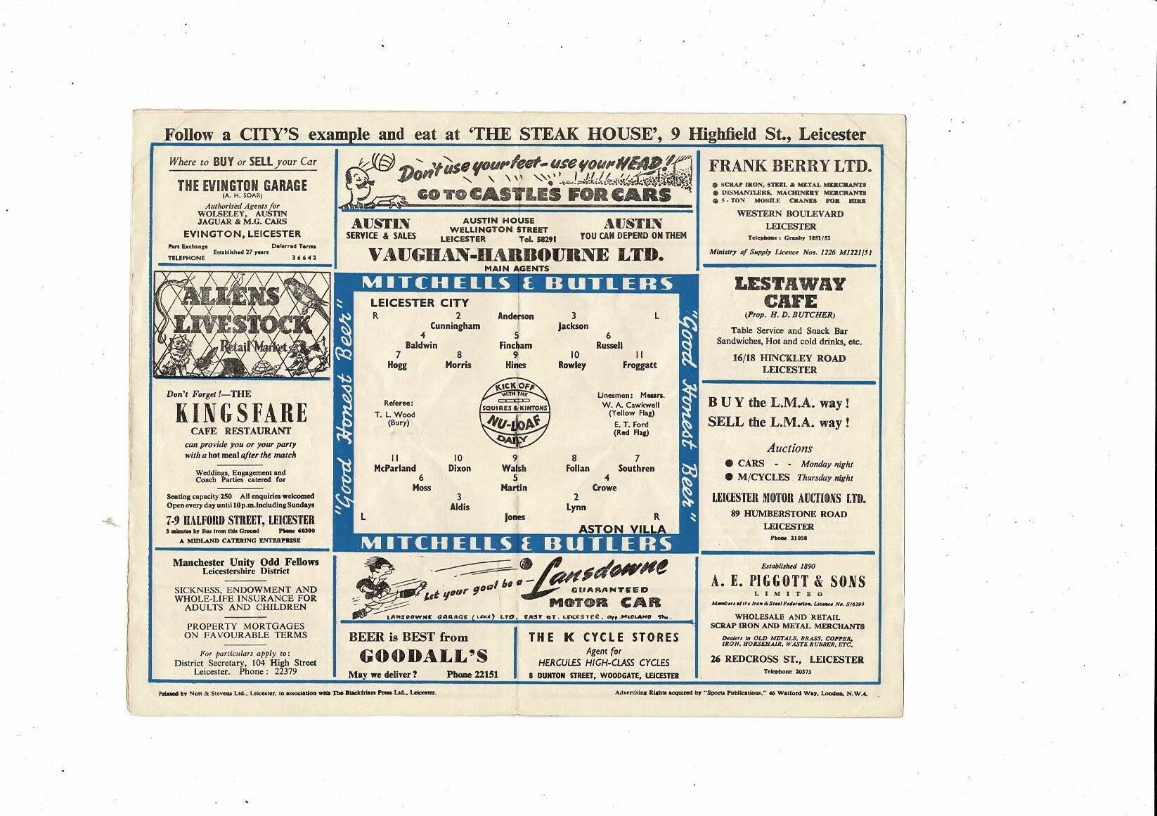 1954/55 Leicester City v Aston Villa Football Programme