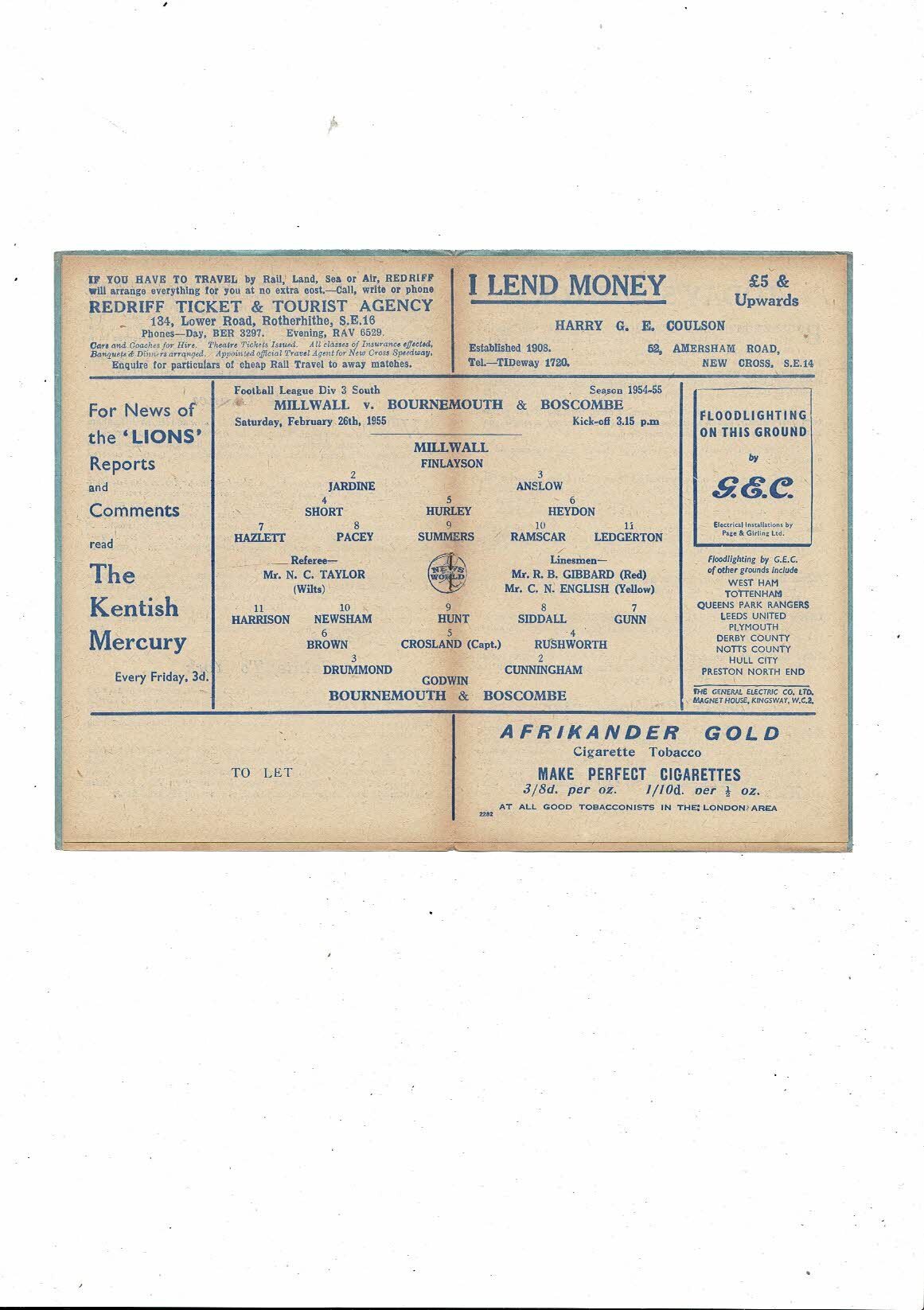 1954/55 Millwall v Bournemouth Football Programme