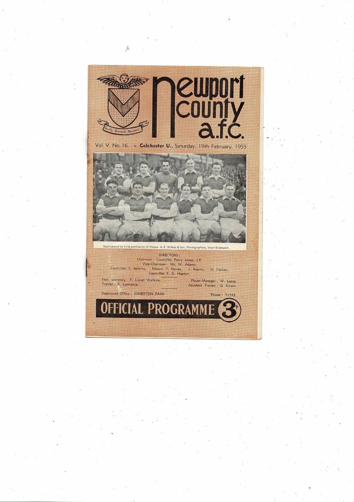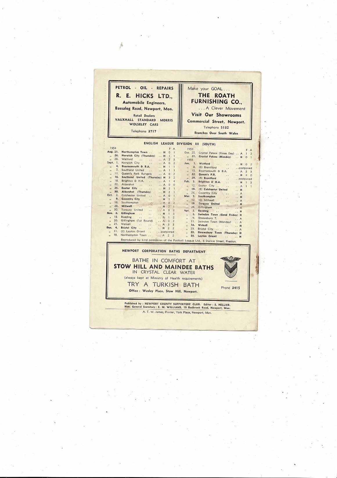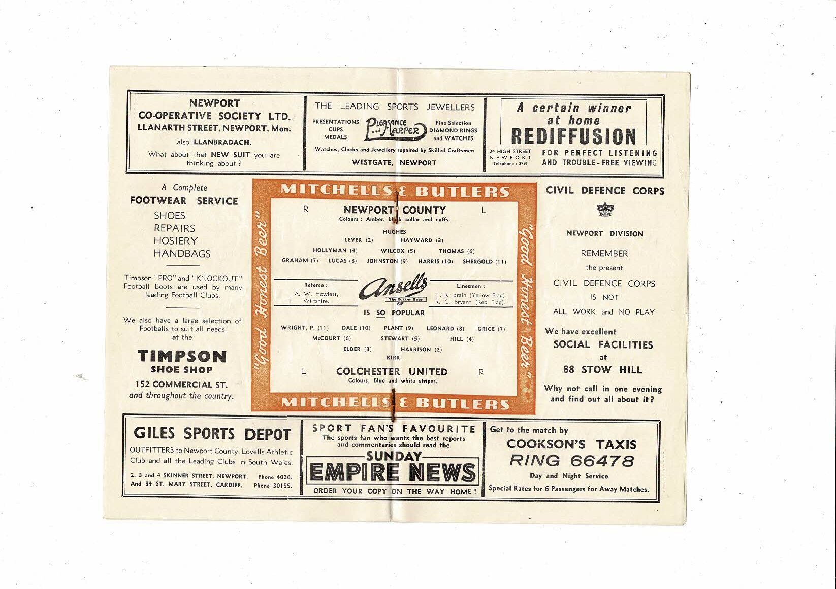 1954/55 Newport County v Colchester United Football Programme