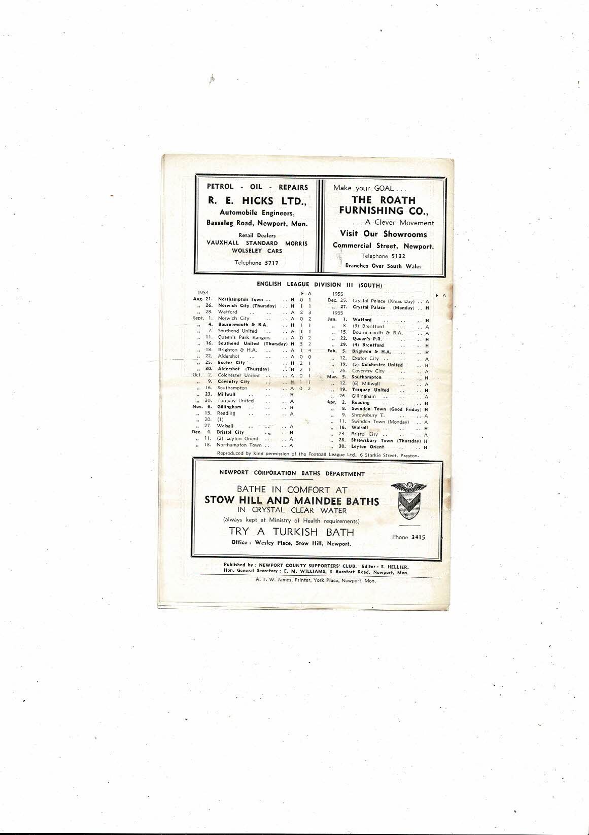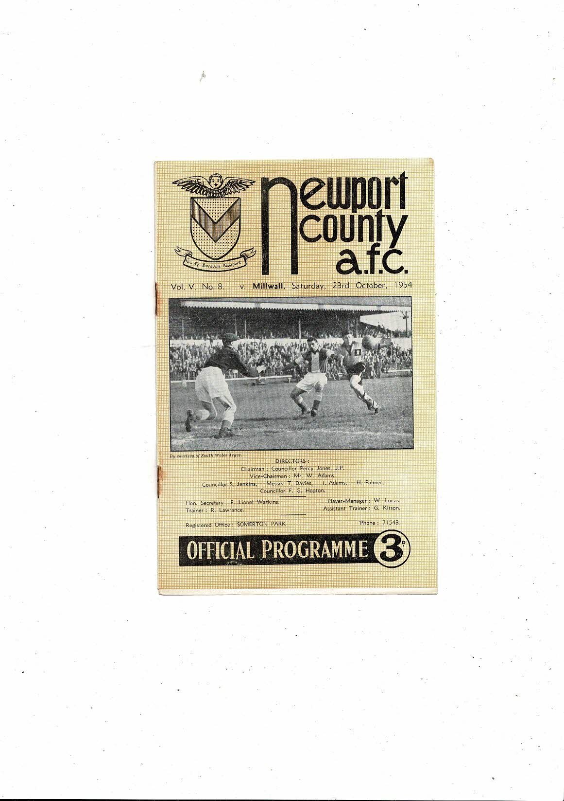 1954/55 Newport County v Millwall Football Programme