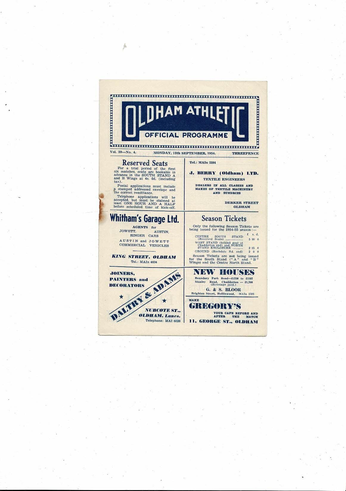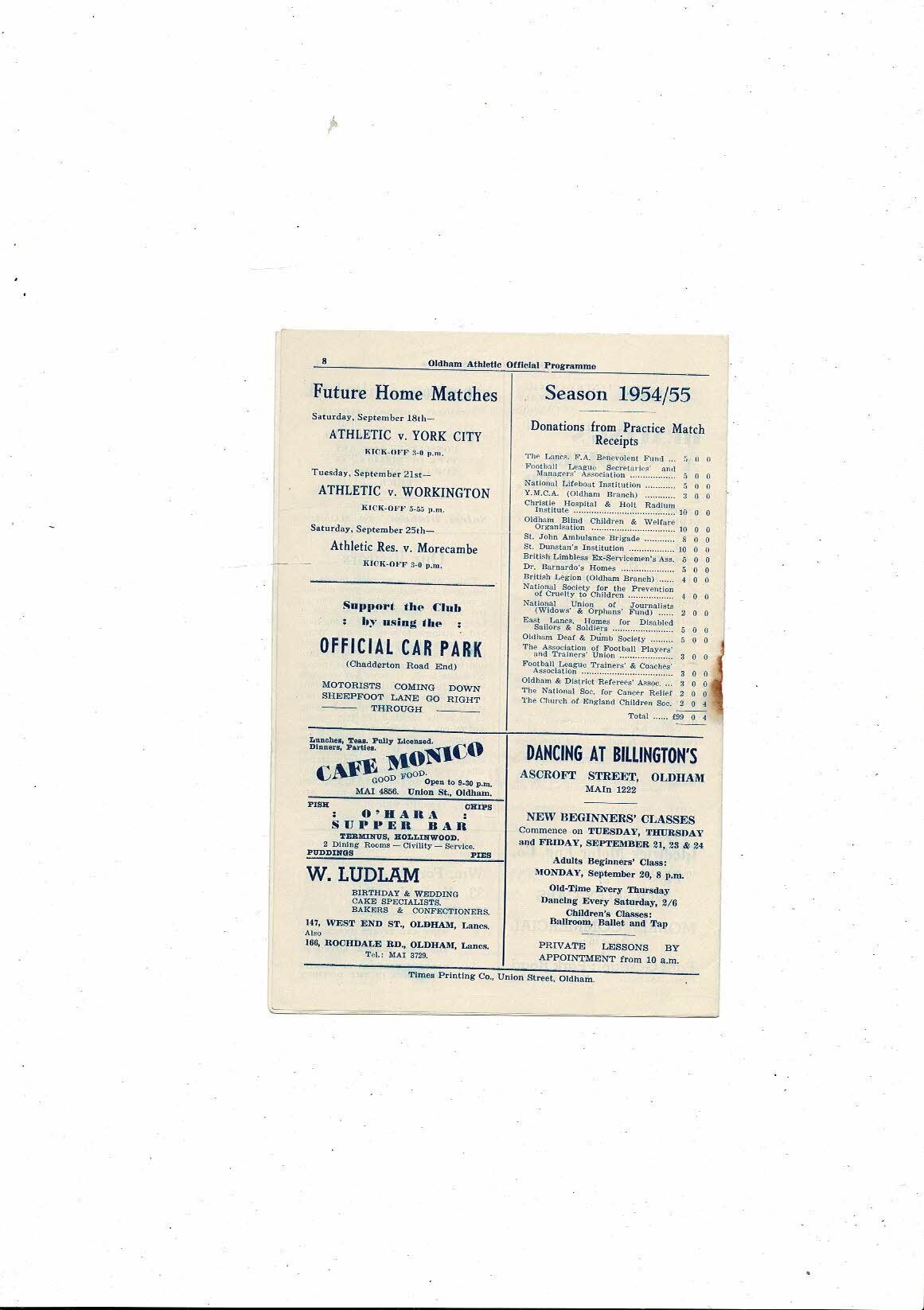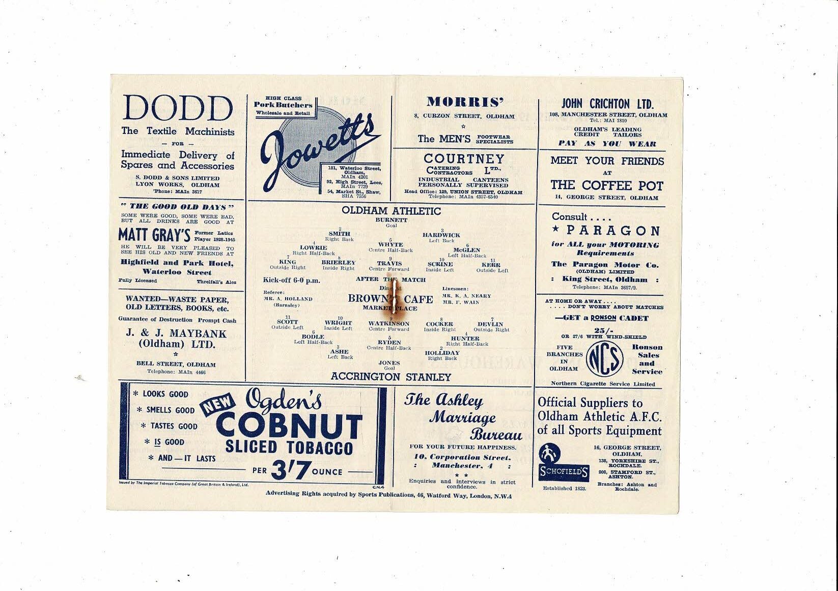 1954/55 Oldham Athletic v Accrington Stanley Football Programme