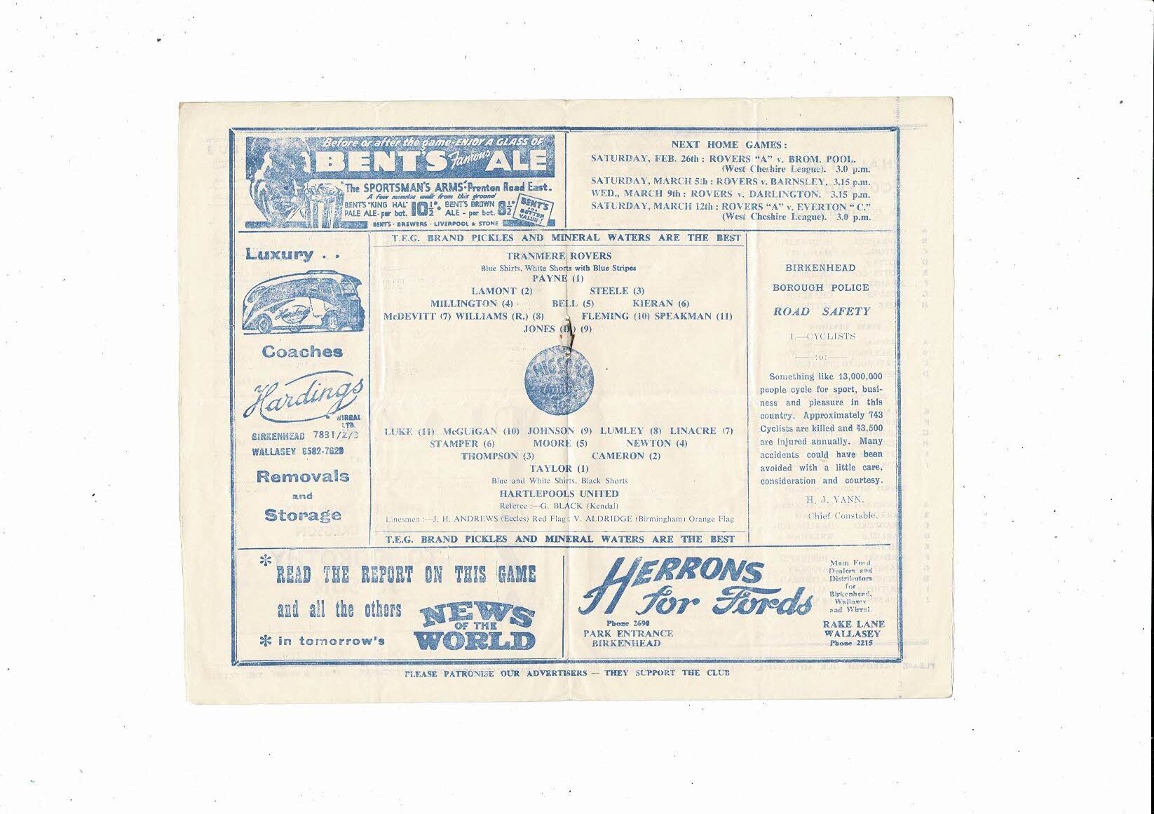 1954/55 Tranmere Rovers v Hartlepool United Football Programme