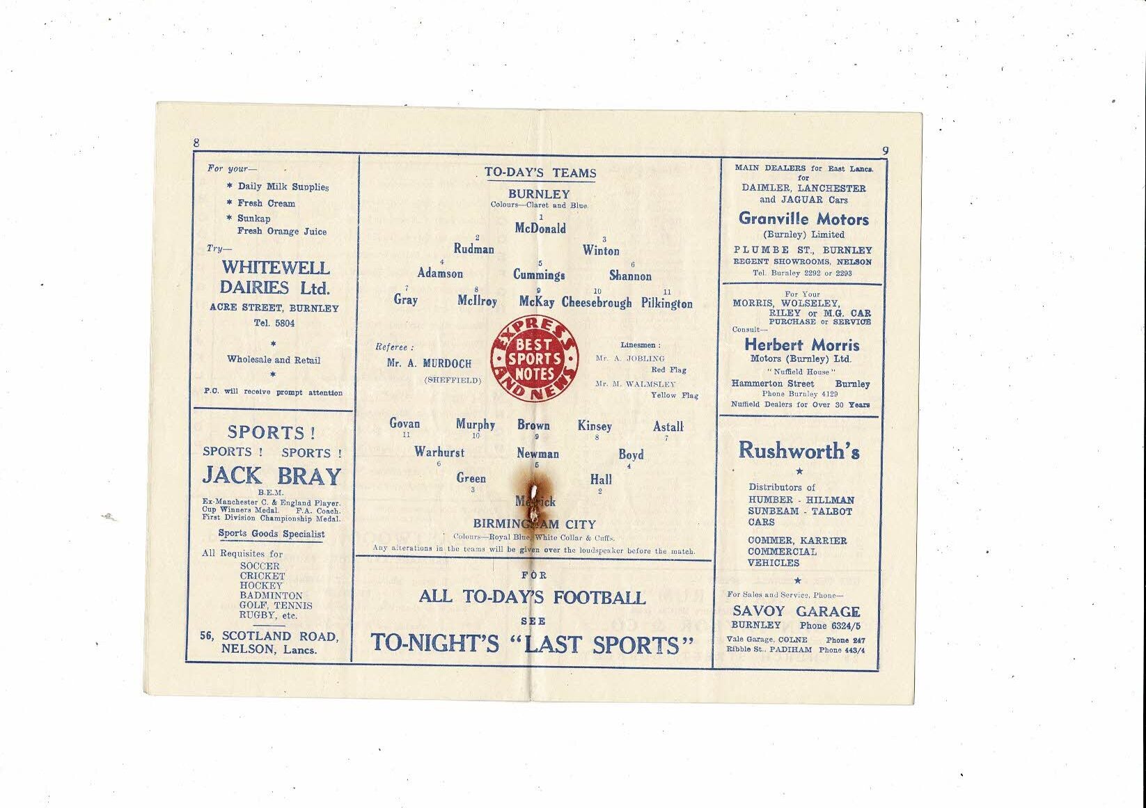 1955/56 Burnley v Birmingham City Football Programme