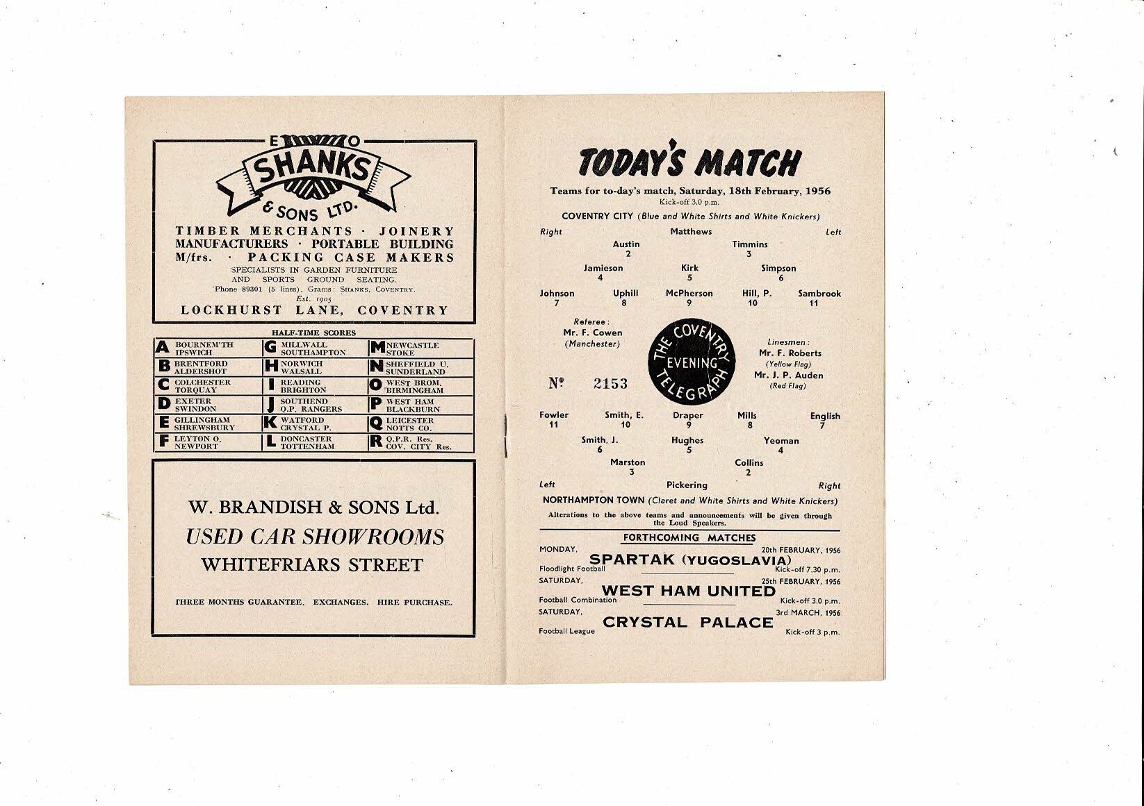 1955/56 Coventry City v Northampton Town Football Programme