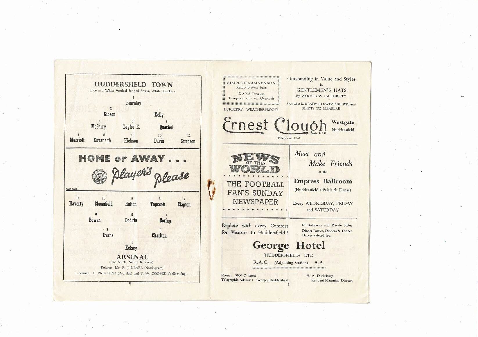 1955/56 Huddersfield Town v Arsenal Football Programme