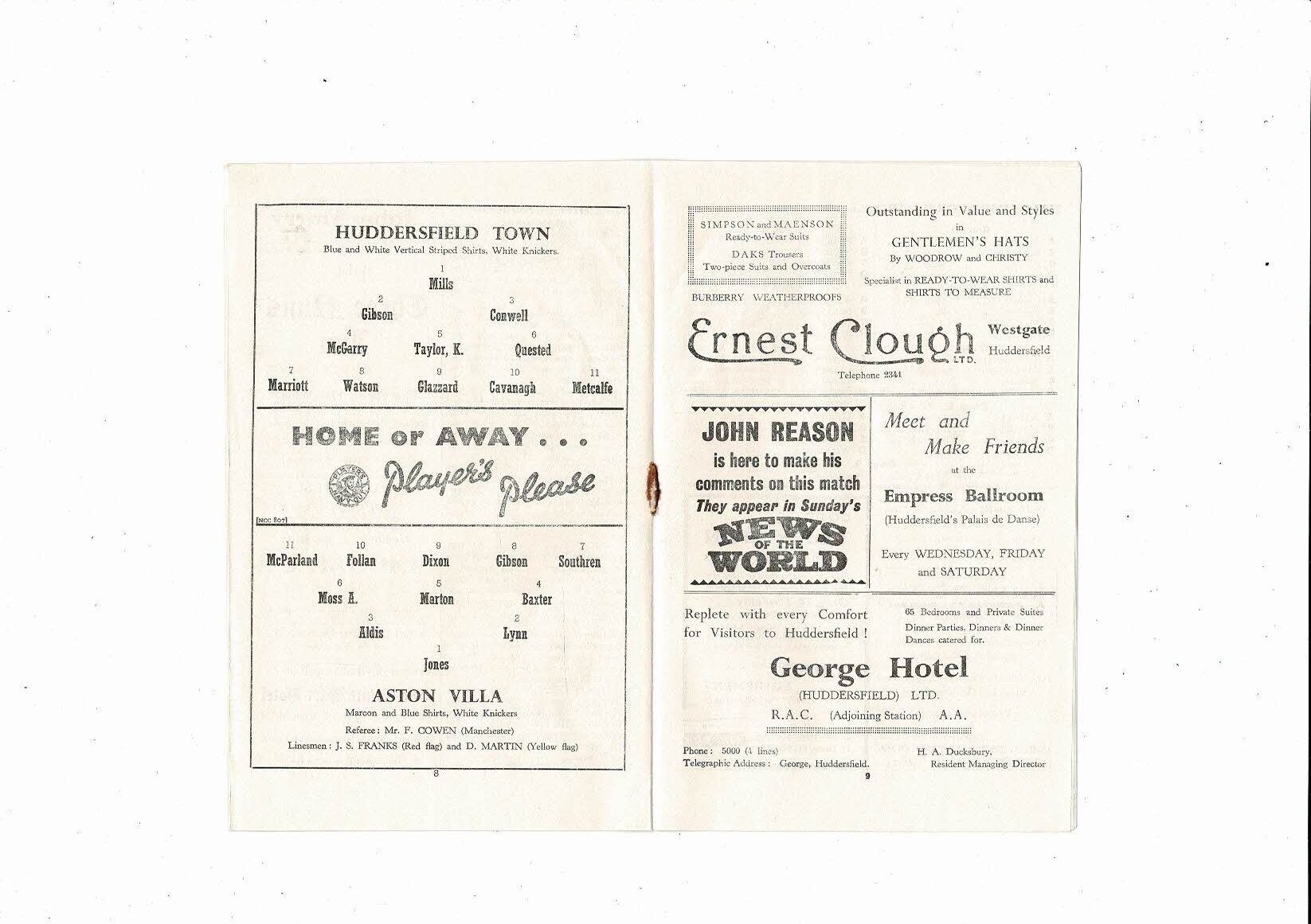 1955/56 Huddersfield Town v Aston Villa Football Programme
